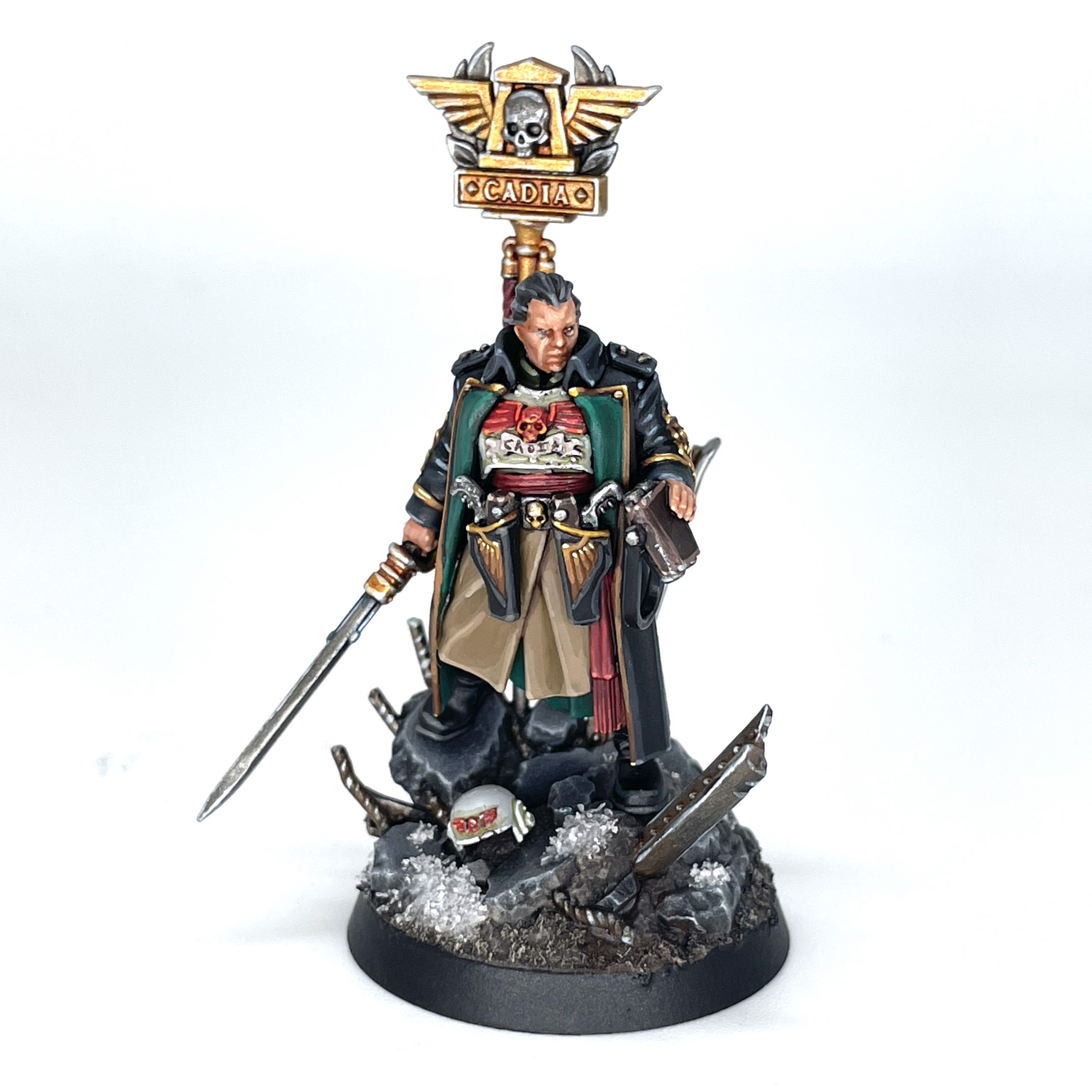 I painted up a crew of character models next, but I'll start with the best of them - Ursula Creed. In my curiosity, I found that her extremely out of place helmeted head is a reference to when