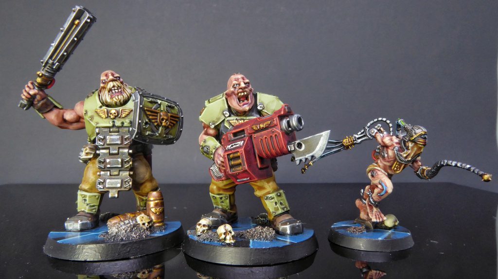 I've not yet gotten to play with retinue characters yet. For those who aren't up to date on Blackstone, after you complete their mission, you can pick one of these semi-AI controlled models to pal around with your band of explorers. They look interesting to use and the missions to unlock them all look like fun ways to spice up the Blackstone experience. I never get enough opportunities to paint Ogryns, so when I saw there were two in last year's Annual, I went out and bought a box immediately. For Penitent 707, I once again followed on of Darren Latham's great Youtube tutorials for all that skin. It's made me learn that I need to be pushing my constast a lot more.