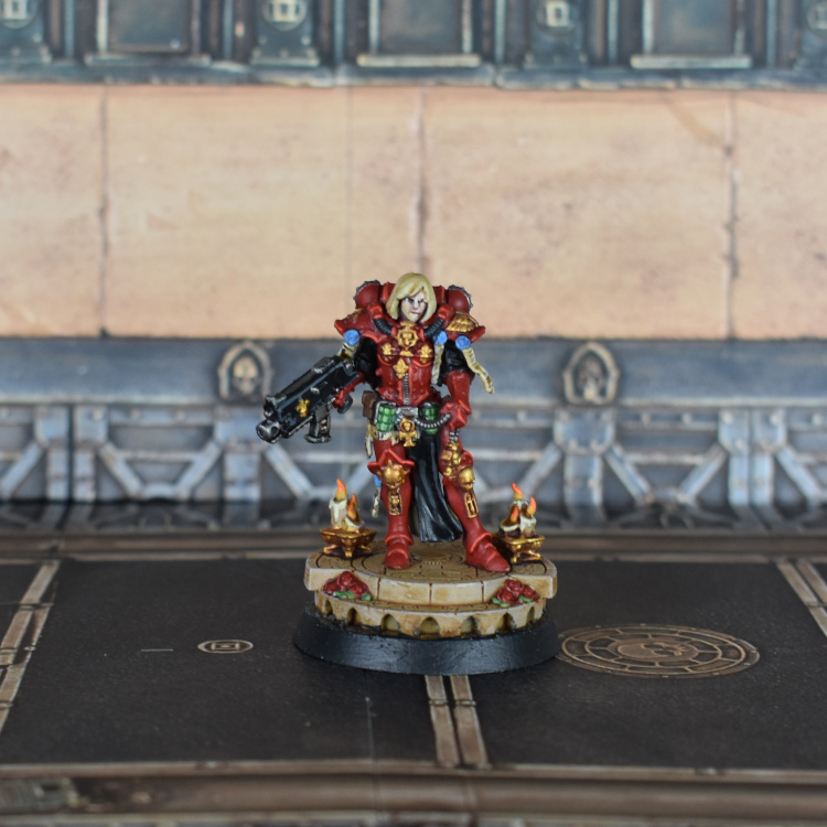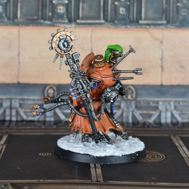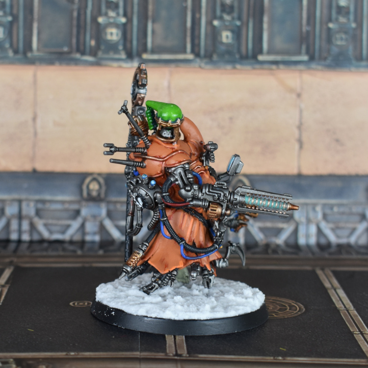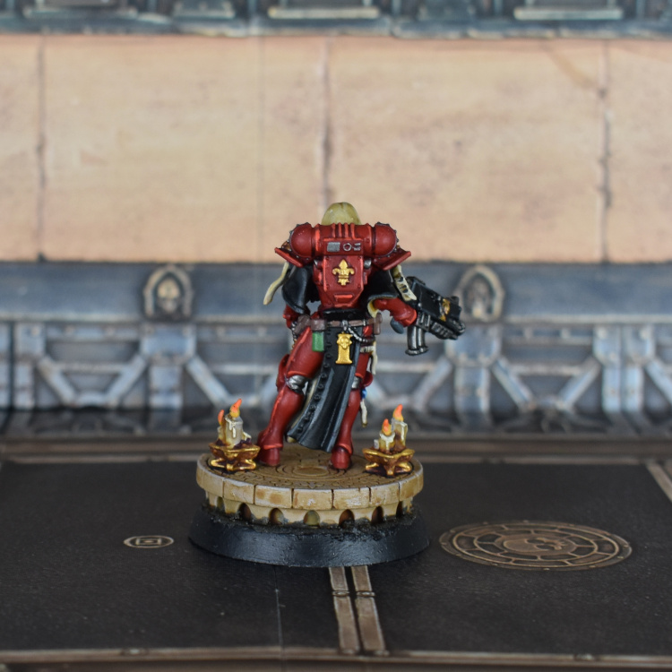 Daedalosus was the first one I painted, as I was very nervous about his red robes. Almost all of my armies are based with martian-style badlands ground, so I generally try to avoid majority red paintjobs to prevent the models from blending in too much. For Pious Vorne, I wanted to try out Darren Latham's flame tutorial before it got scrubbed from YouTube. I definitely did not get it as easily as he showed in the video, but I think they are my best flames I've painted yet. On X-101, I tried the new trend in painting yellow - zenithally airbrushing it over a pink basecoat. I liked it a lot, but unfortunately the servitor isn't as yellow as I first thought I think I lost most of the pink.