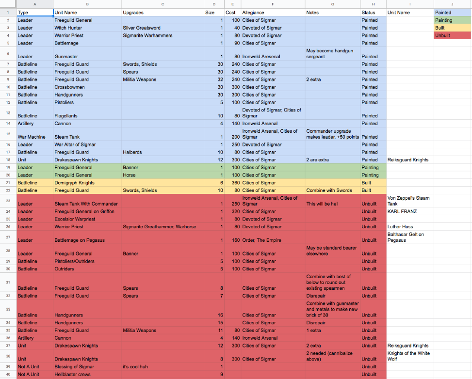 Otherwise, I assembled a few models for my Empire and Daves to Darkness armies, as I've been spending a lot of time away from my painting desk. I finally got around to organizing my Empire army and taking inventory, which hugely reduced my anxiety on painting anything. I'd forgotten if my units had enough dudes, how much cavalry I had, etc. and that kind of paralyzed the thought of any further progress. I even color coded my spreadsheet, which I'm sure won't instill any terror in me, right? Oh god why is there so much red
