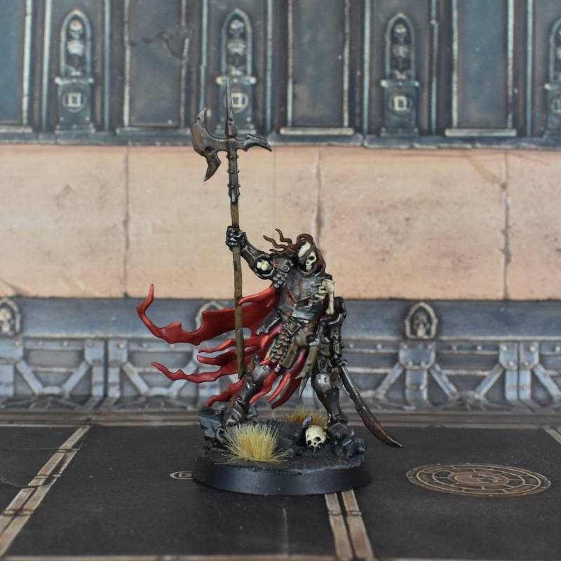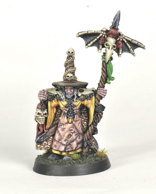 For this vampire I veered away from my normal approach quite a bit. I went for strong directional lighting from the sides, more brightly lit from his right. His right has warmer tones mixed up to Scale75 Hyek Yellow. His left has blue grey mixed for most colors up to a highlight of Citadel Pallid Wych Flesh. Everything is painted with a limited palette of grays and browns.
