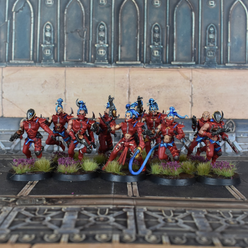 Finally I painted a whole bunch of new Drukhari. I have a large Drukhari army already, but a lot of it was painted as much as 10 years ago, and is both not that good and, in some cases, fairly badly damaged. It's also somewhat boring - ironically enough, with a black and red scheme similar to the Ad Mech one above, but executed worse. With that in mind I decided to try out a couple of new schemes for Kabals and Covens, knocking out 10 Hekatrix Bloodbrides and some Kabalite Trueborn as well as a new Archon. I also painted some Wracks I'd had waiting in the wings - naturally I finally put a liquifier on one of these just in time for the Dark Technomancers nerfs to go through. I also painted the new Lelith in the same red Cult scheme.