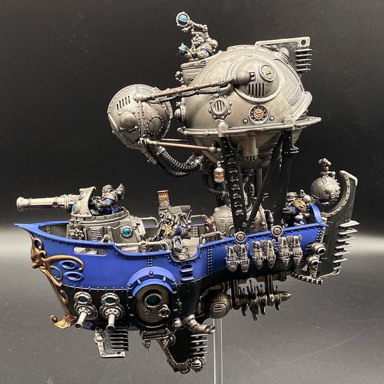 I've been taking a break from painting (so many) Titans lately to focus on something entirely different: Kharadron Overlords. I wanted these to look dark and cold, based on mountainous snowy rock with the elements really getting to their gear. I don't actually know if it's canonical but I don't see how using aether gold as a source of power would run hot and melt the snow and ice off of the ships, so I got some Krycell brand Ice and Snow Wash to try out on the Endrins (those balloon things) and the decking of the ships as if they were in the middle of a snow storm. I also really dislike the little easy-to-break flying stands GW has moved to in recent years. The ball joint ones are ok for the Gunhaulers it seems, but for the little flying dudes I just built up more cork to attach to so they're an appropriate height. The Ironclad (and future Frigates) however needed a nice big acrylic rod instead to keep it stable since it's too front heavy to go on the ball-joined stand like the Gunhauler can.