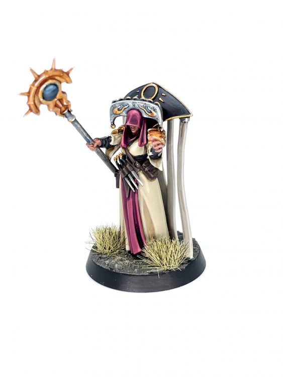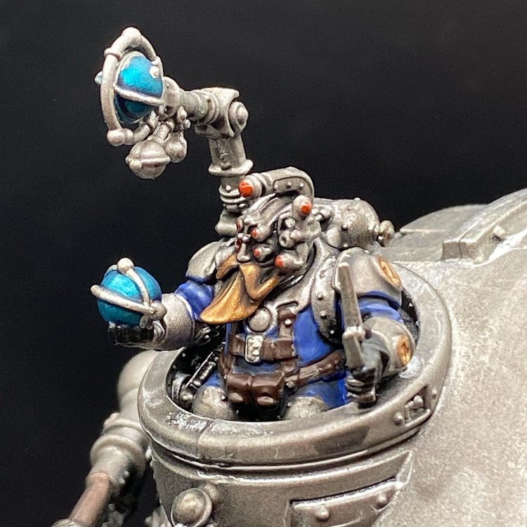 Emelda Braskov was a model I was pretty stoked to paint. The moment I held the model I knew I wanted to paint her in a scheme reminiscent of a Warcraft 2 footman by way of the old 'Eavy Metal technique for painting Grey Knights from 3rd edition. This intersection of nostalgia meant I used some of my precious Guilliman Blue glaze. While I went for a classic "heroic" scheme with her, I decided on something a bit weirder for Octren Glimscry:
