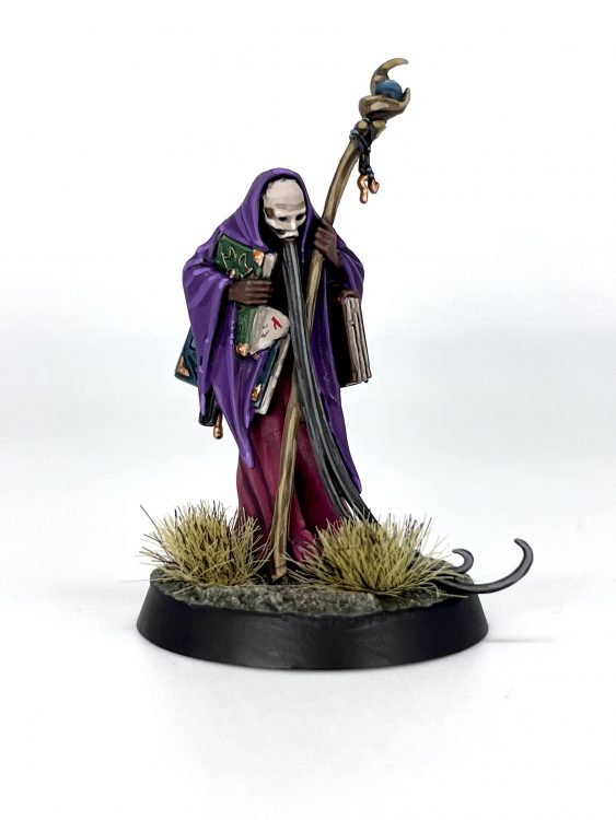 After establishing how to paint bones with Octren Glimscry (foreshadowing!) I was able to knock this guy out pretty quick. There isn't anything to him I haven't done already with the Kusagi, so he was also pretty relaxing to paint. I don't know if I'll do the dual cape colors for the rank and file skellies, as I think it marks him out as slightly more important than the normal Bone Buds. They're next on my painting table, so look for them soon!