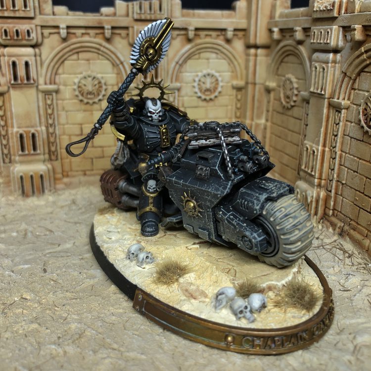 The first part of this month was spent preparing for my first tournament in a year and a half: The Salty Alliance GT in Tooele, Utah! I didn't have too much to do in preparation, but these things always take longer than I anticipate. I needed to build and paint a travel-sized display board and accompanying terrain, as well as paint a Primaris Chaplain on Bike, a singularly badass model and one that I've been looking forward to painting since its release! The travel board was straightforward enough, with a piece of 1/4" Birch Plywood cut to 15"x22" size. I then applied fine tile grout for the ground texture, using a piece of lightly crumpled tinfoil to give it variation. After that, I painted it in the same process as my basing. The terrain elements are separate from the board for ease of transport.