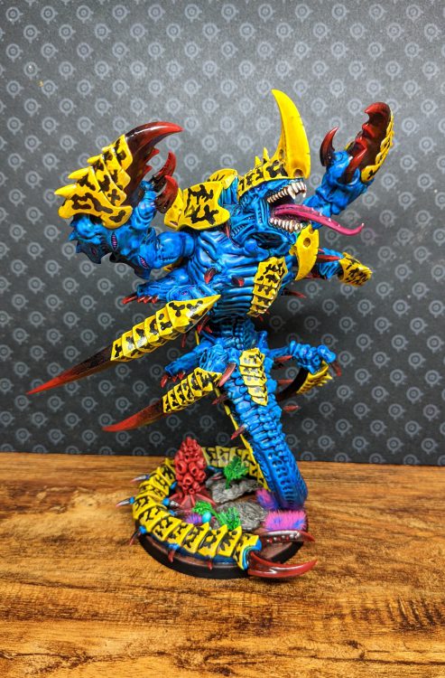 Okay technically he's a Hive Tyrant. He's also been a WIP for over a year. Rob's putting together a new campaign and me, not being satisfied with already having an army of purple Regal Skulls, and working on defeating my backlog of bugs. The skin and yellow pieces were painted using the same technique as Rippy the Ripper, but after some more thought I changed the claws to be a steady transition from black to red. I start with a layer of Contrast Blood Angels Red, then blend between using Liquitex INK! Carbon Black and Pyrrole Red until I achieve the desired blend. I also added some extra plants to the base. In addition to the GW flexible plants, I 3D printed some designs from GrimGreeble that look amazing. I highly recommend checking out his designs, which are available on multiple sites including Thingiverse.
