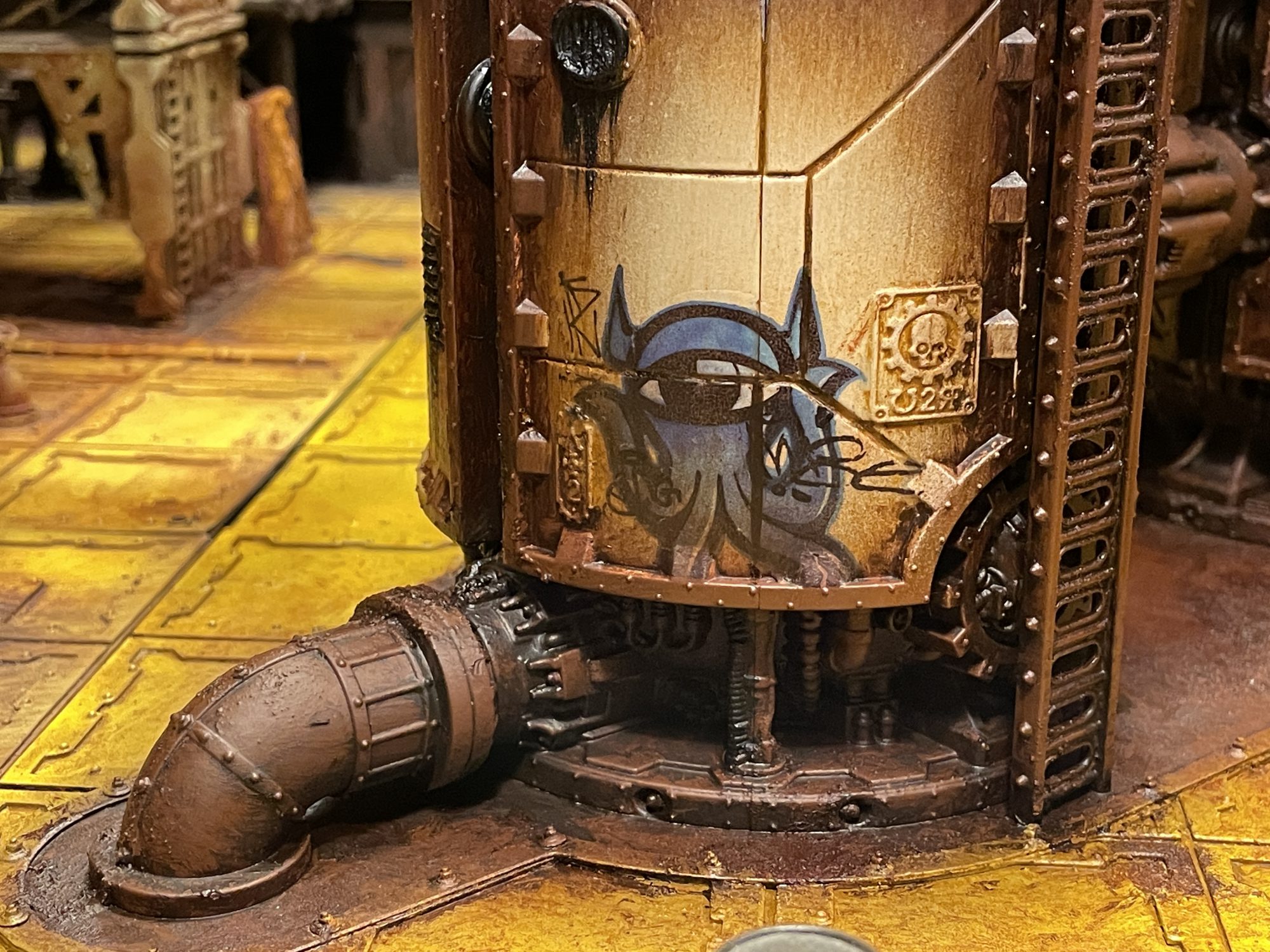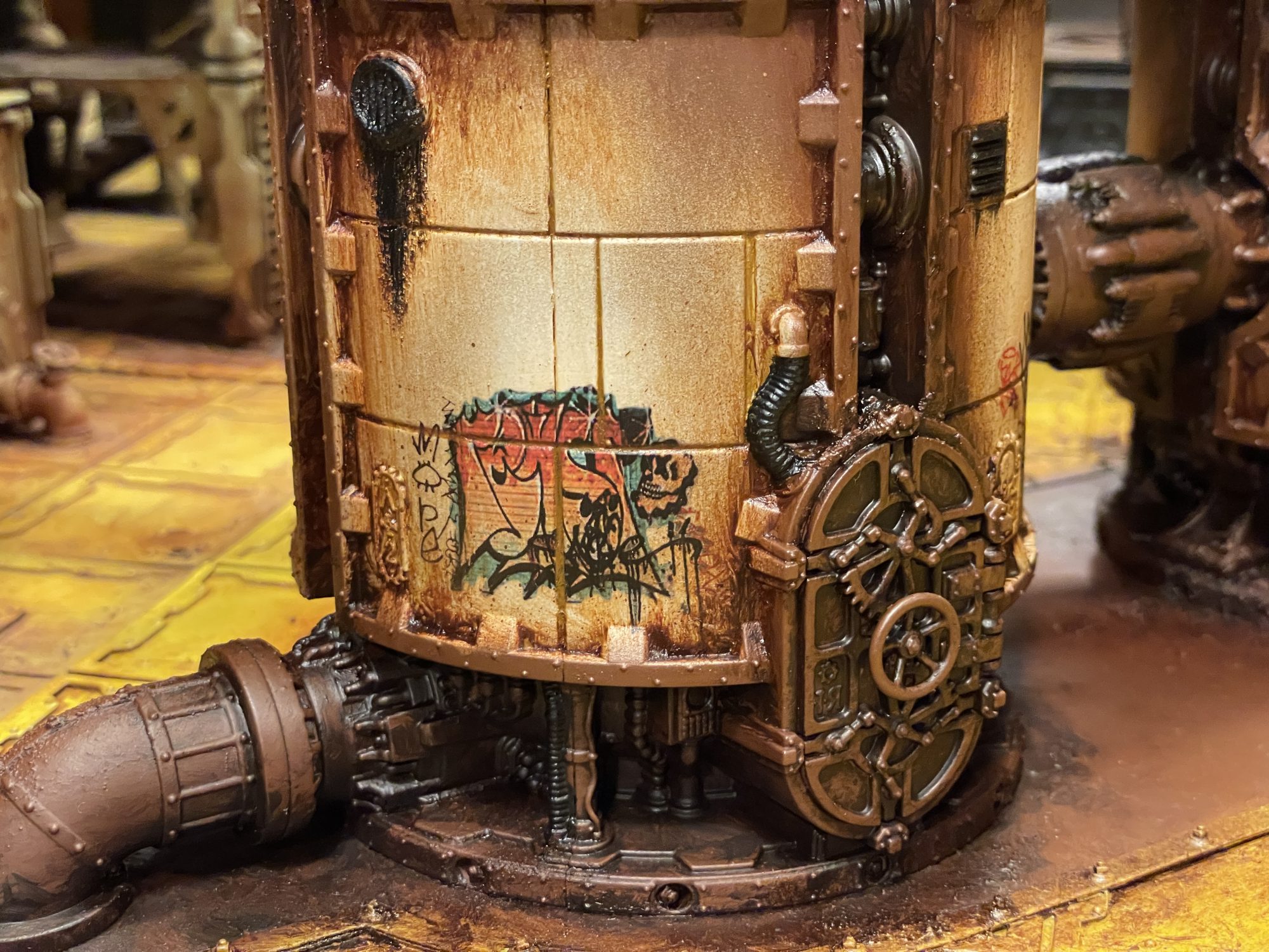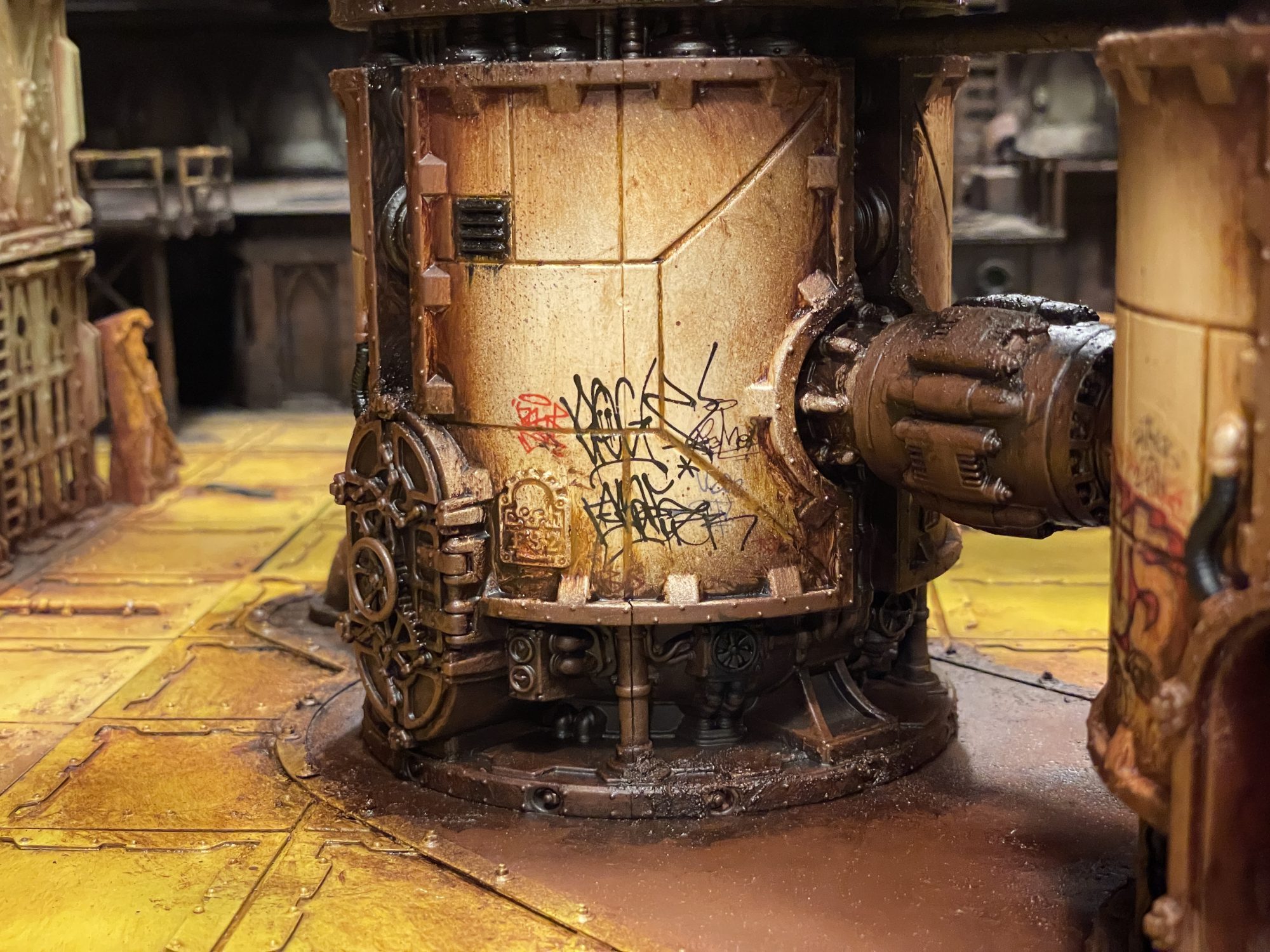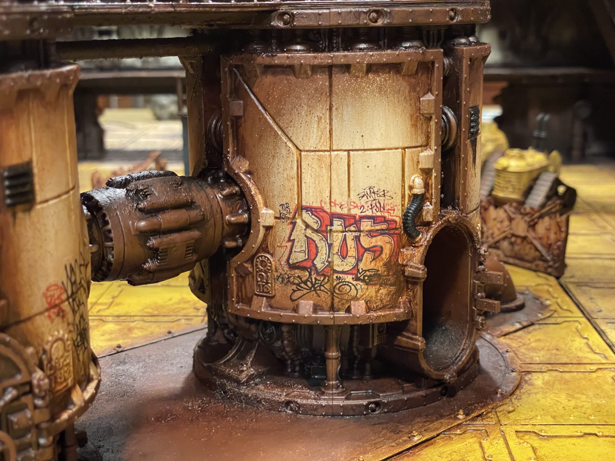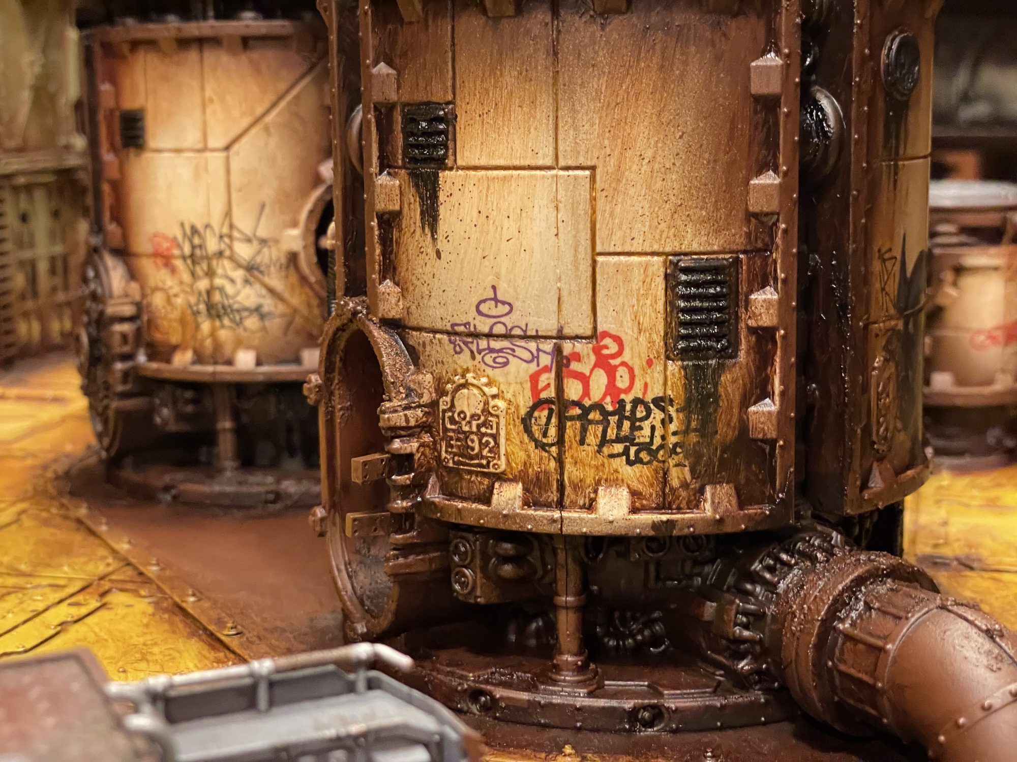 Last piece for the month is this complete tile, that was a new version of one of the first tiles I made back in 2018. Instead of domes and smokestacks, I designed and cut a connected platform for the top. I went all in on adding graffiti on this one, using a mix of O scale train decals and custom ones that I printed myself. Absolutely love how it came out.