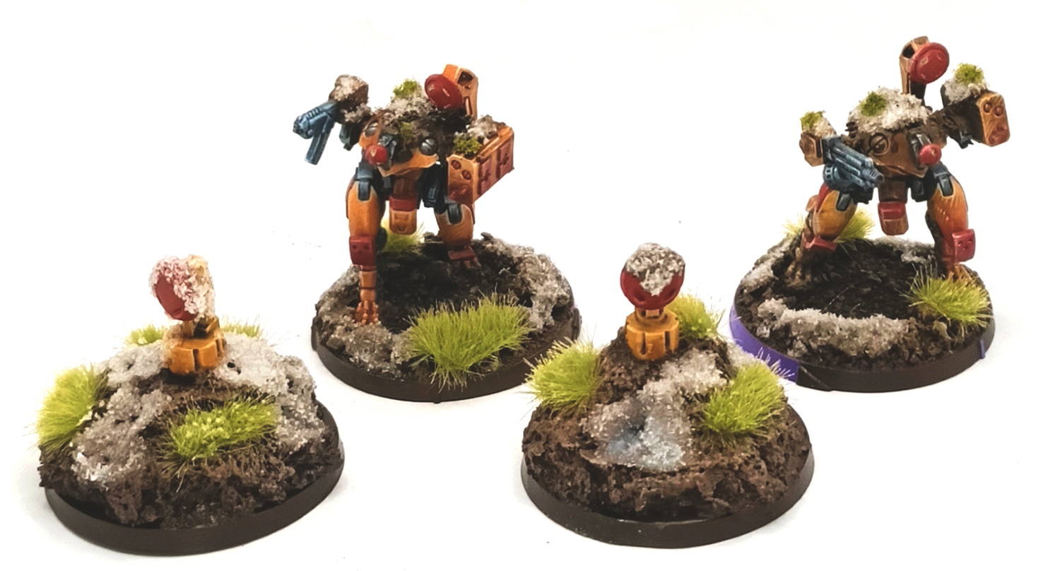 These bad boys are 'Long Ya' remotes. They are sorta like sentry-drones, sitting camouflaged until someone gives them a good reason to pop up and say hello. I decided to go ham with selling the narrative of them emerging from a prepared position and threw a custom mix of textured paint on top of them, as well as some snow and flock as well as modelling their base to make it look like they were 'nesting'. Then I cooked up a pair of custom camouflage markers that represent the 'Before' photo, with their sensor-array/radar dish poking up from a mount of dirt.