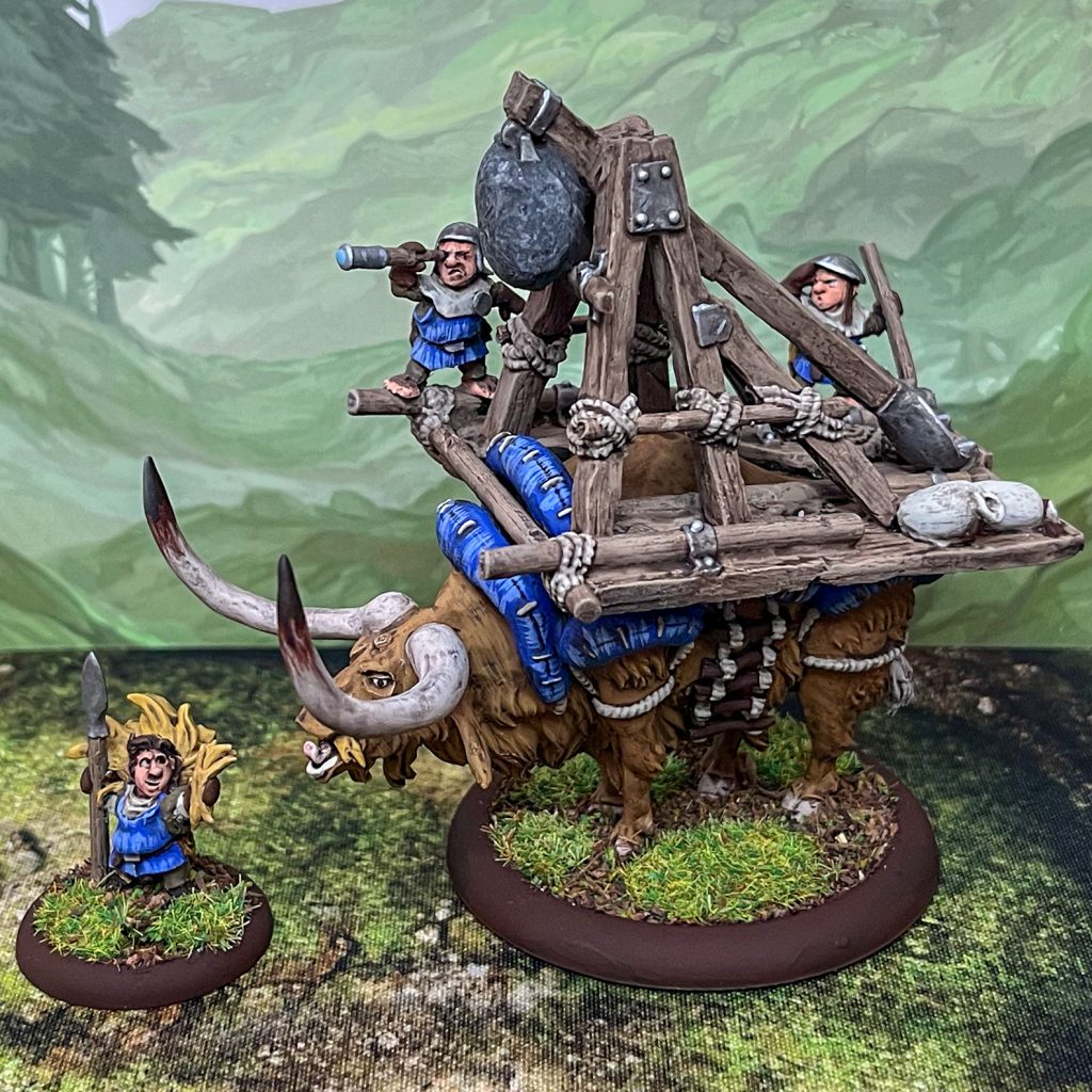 just these I added on more models to each. The most fun here is the Thing Flinger for the halflings, a massive catapult strapped to the back of an ox and crewed by a few halflings to fling...things. It's just wonderful! I love that the Imperials are a mix of Halflings, Humans, an Ogre and even a monkey; the halflings are an older set that they sell, not really