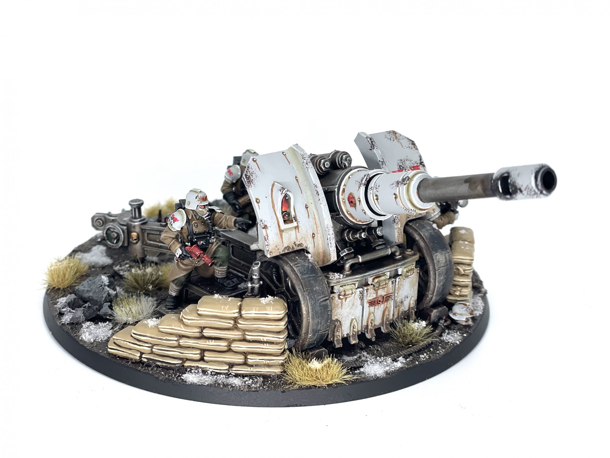 own models. I broke it out into subassemblies of the crew, gun shield, gun barrel, and base with the gun carriage, and slowly chipped away at it on and off for a month and a half. The end result is an awful lot of work for 95 points and I have no clue how to store the damn thing in an army case, but man am I happy with the outcome. I dressed up the base a ton because if you've got a base the size of a 45 record, you better do something with it. It was also the last model I worked on at my old place and the first I finished at my new one - you see, I can blame May's glacial hobby progress on packing my entire life up into boxes and schlepping it down the road to a new address.