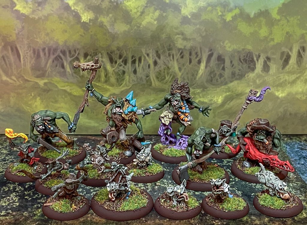 lot more sense after learning that their first edition name was "Bayourk" making the switch flip in my head going "oh they're bayou orks, cool" and these were maybe some of the most fun minis I've painted in a while; which is a really high bar at the moment! There's a lot of really lovely models here but the best ones, to me, are the Boglin with banjo, Boglin riding a Swamp Critter with wooden sword, Boglin holding the catch-of-the-day fish (he's got the torch too), but above all the Brute using a "pet droggo" as a living flamethrower while smoking a cigar. The amount oc charcater in these sculpts is just so good!