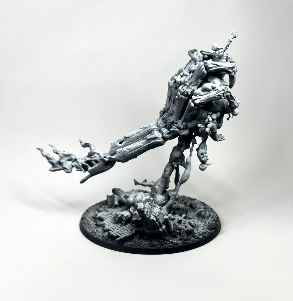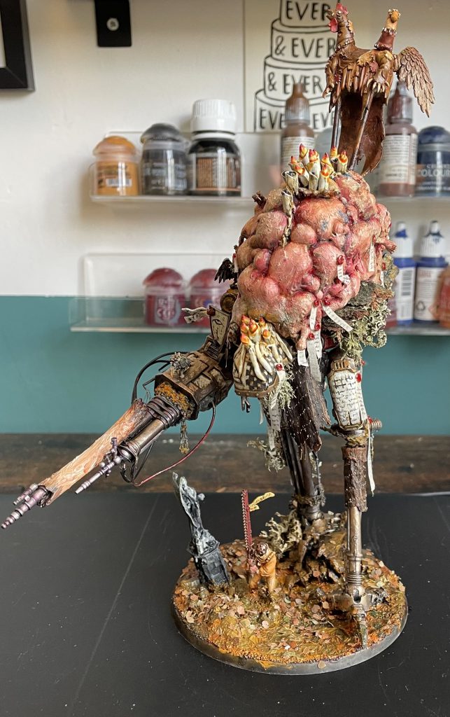 Another month, another armiger. No great revelation of a personal or political nature in this one, just a great deal of fun in finally making good on a suggestion from the goonhammer discord to use the tervigon egg sac for something. It’s got the now traditional lichen and some chicken bone I found on the pavement. I’m sure it unintentionally reveals something about my mental state, which could be characterised by the words “immense stress”.