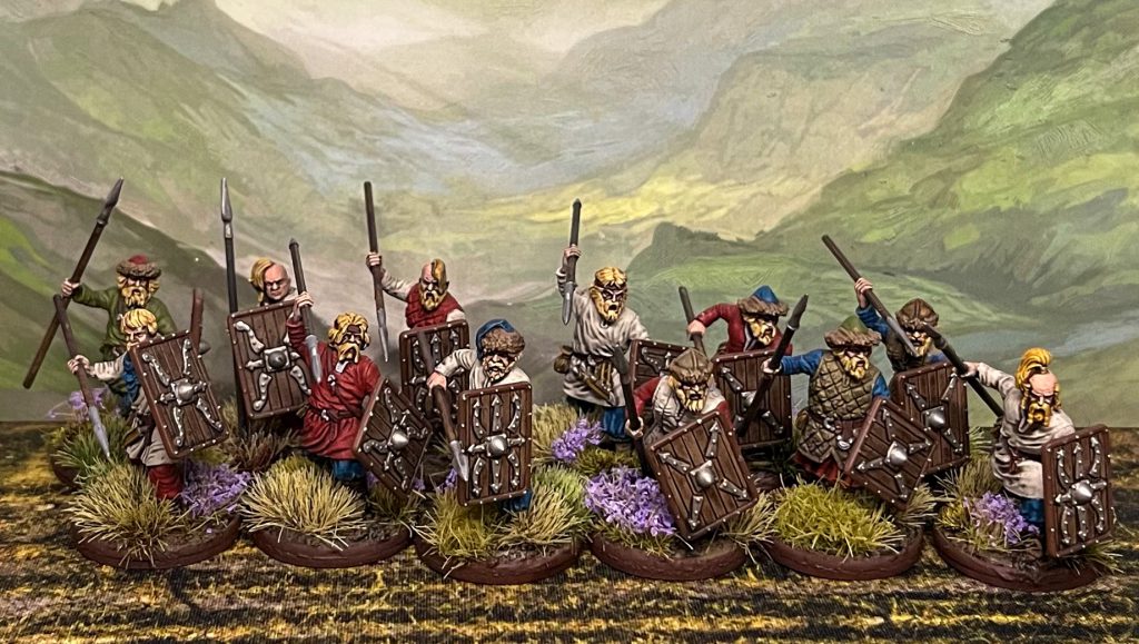 Lastly, and I wasn't expecting to get these done this month but oops(?), I got back to my bag of Victrix Rus infantry to be used as Pagan Rus in Saga. I reviewed some of this kit last year when it released but hadn't gotten to any of the unarmoured guys until recently. Went for more muted tones on these overall and really pleased with how they look all together! One
