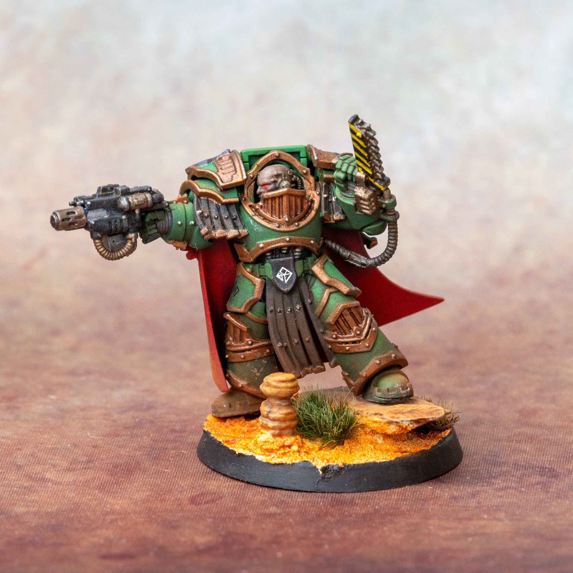 Betrayal at Calth Praetor, which seemed like a perfect test model to try out the scheme. I wasn't really a fan of this model in the past, but after holding it for some time, it really grew on me. There's many different takes on Salamanders, depending on how vibrant you go. I was initially aiming for something with a bit more pop, however am happy enough with the result in the end.
