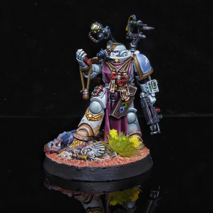 I wasn't really planning on painting him anytime soon, so I am glad I had an excuse to knock him to the front of the queue. Like his veteran brothers, he has a lot of fun textures and excuses for freehand. Another model that got a surprise promotion to the head of the queue was my Primaris Apothecary: