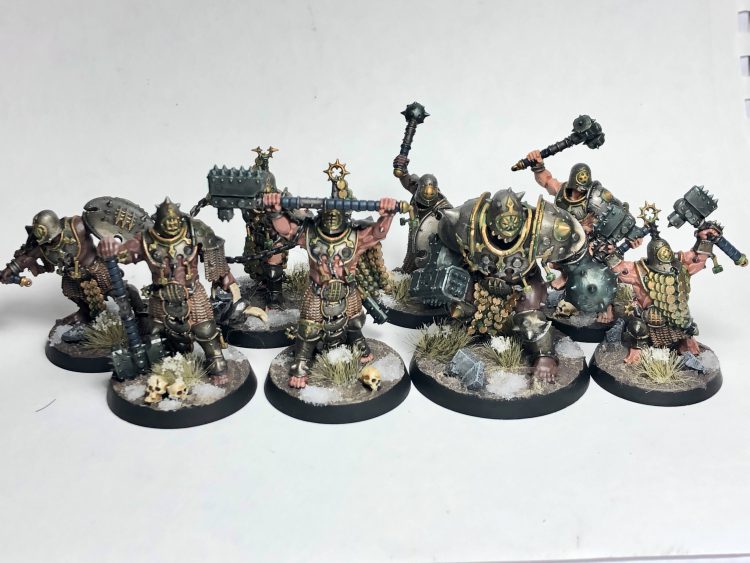As I teased last month, I was working on some Iron Golems. Well, after I decided to make the compounding bad decisions of "don't do a test model", "batch paint 16 models at once", and "paint the armor first then struggle to paint around it", they're complete!
