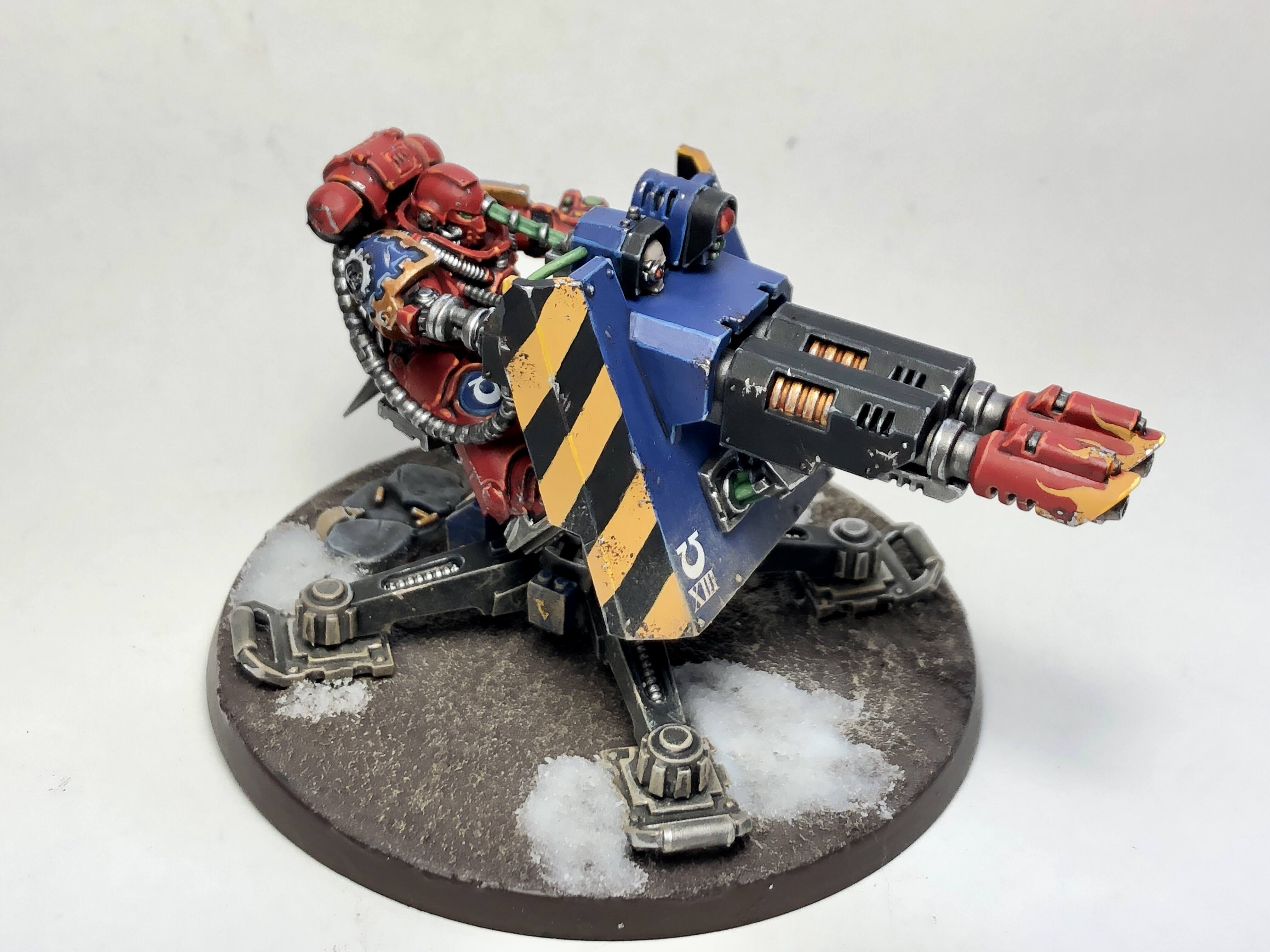 First up is the Indomitus Captain, sitting on the sidelines since August while I built up the motivation to spend a day working out how to paint molten blades. I think they've come out well; they're a blend from mephiston red through wild rider red to VGC Hot Orange, with a line of GW Yriel yellow and a yellow glaze to tie it together.