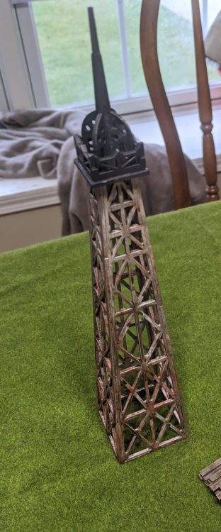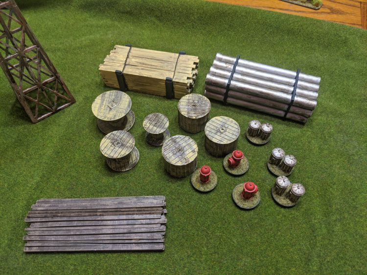 Here's some scatter terrain, mostly from Warlord Games. I bought a whole warehouse / construction set from them and it's all in resin and looks great. I mostly just did washes and drybrushes on these to bring out details. The radio tower will work nicely for WW2 or Walking Dead scenarios as an objective.