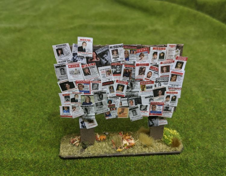 I got the idea for this piece from a panel in issue 175 of The Walking Dead. Michonne and her group find this board and on it is a missing poster for a key character. I just made a sign out of popsicle sticks then printed off these missing posters and glued them on. It'll be a nice flavor piece but also a good piece of cover in The Walking Dead.