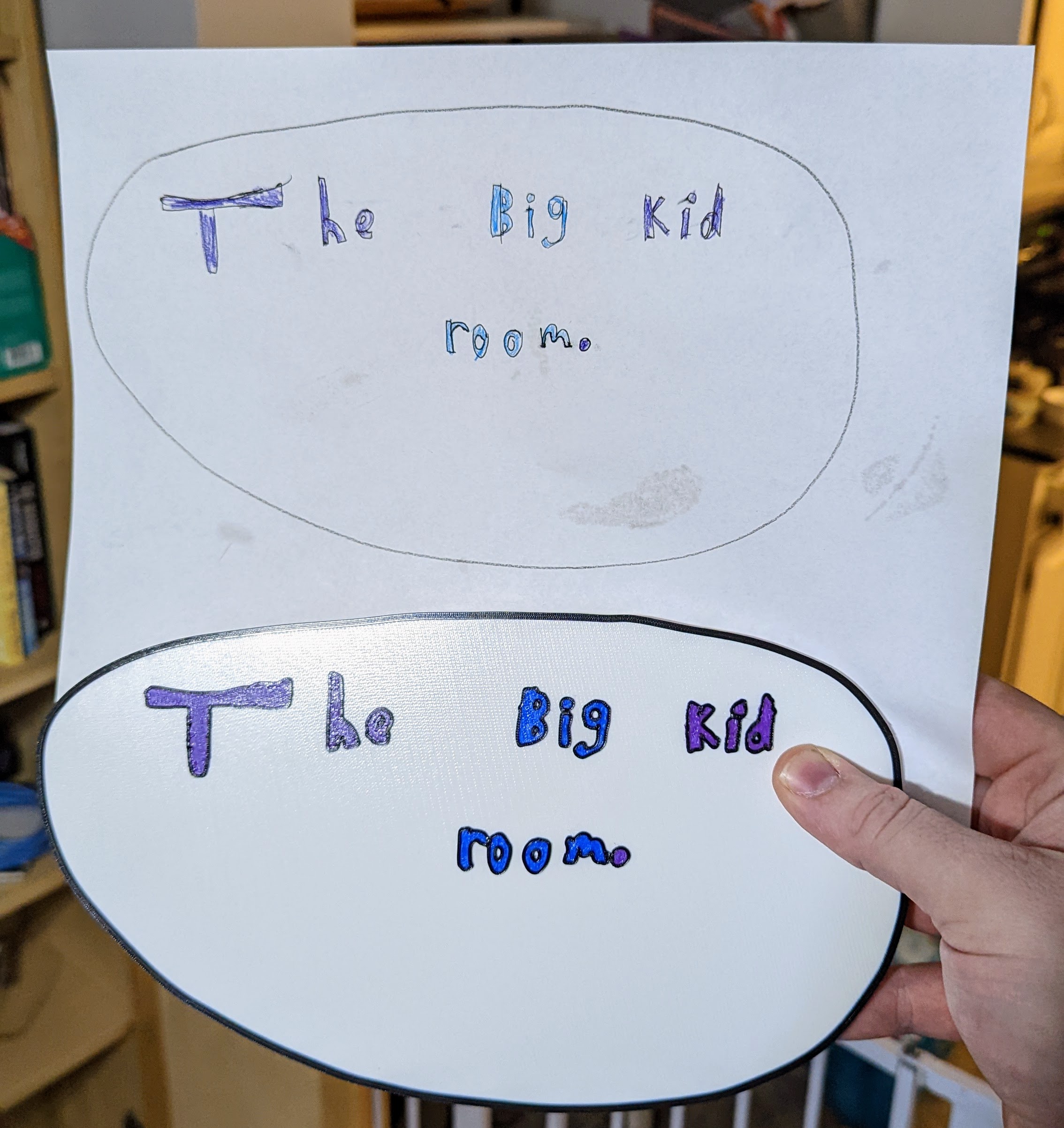 That same method also worked really well on an even bigger challenge; taking the picture my daughter drew of the sign she wanted and converting it into an actual sign. The process for this is the same; take a picture, convert it to vector format, reference that in CAD, print it with different layers. Cleaning up the text was more of a challenge, but I think the end result turned out great.
