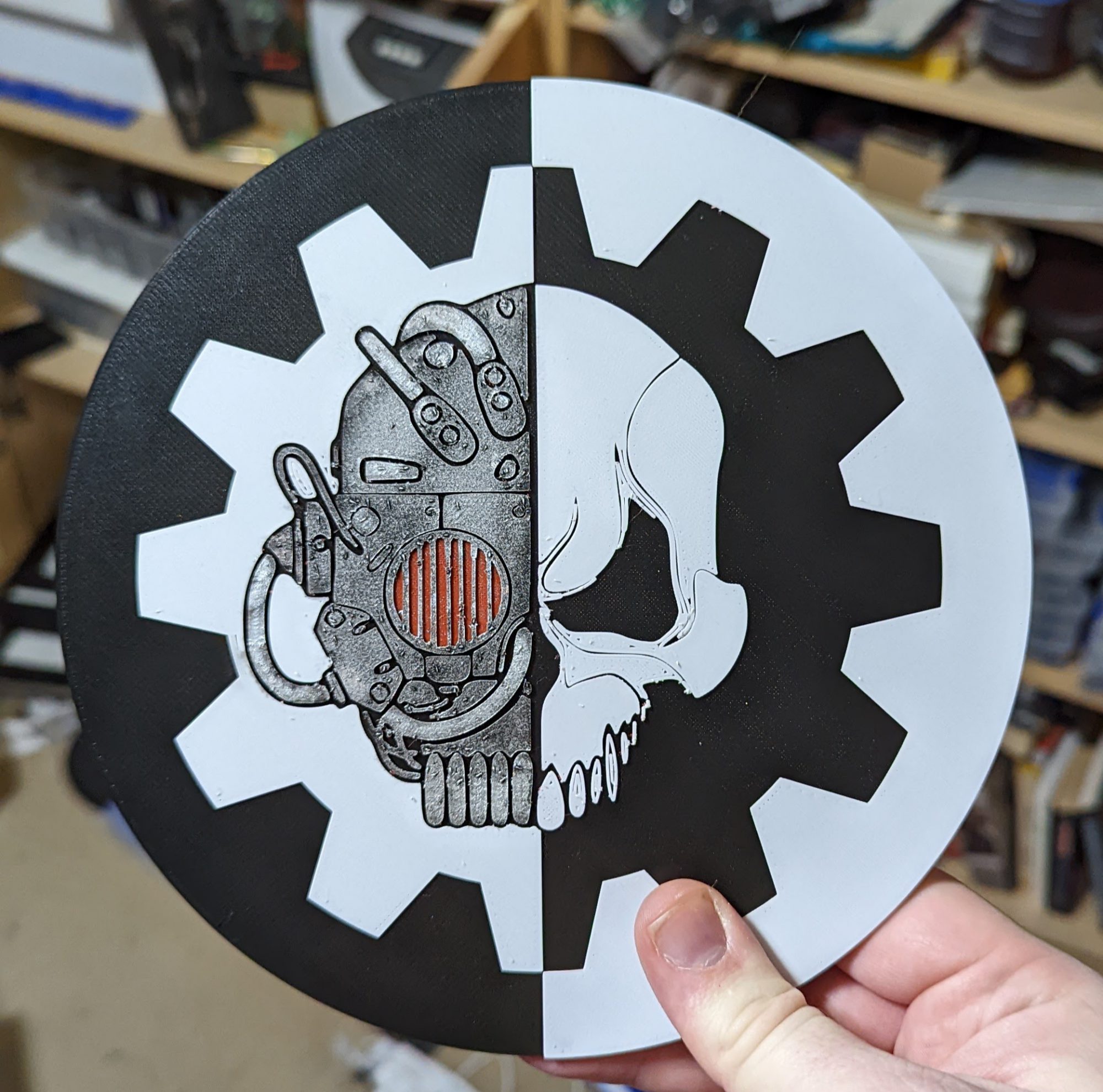 3D printed and painted Adeptus Mechanicus logo. Credit: Kevin Genson