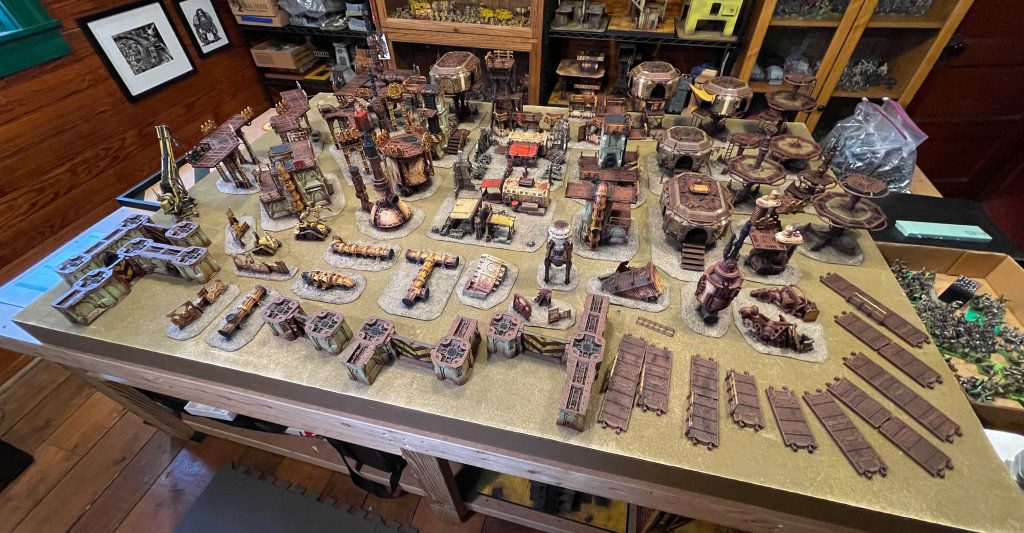 November saw the completion of a project that I started back in September for none other than Dan Badcast himself. Dan assembled all his Necromunda terrain over the summer and shipped it to me at the end of August. I hit the ground running, stealing as much time as I could early in the fall to maximize the good weather. Countless rattle cans, tubes of oil paints and pots of acrylics later I was able to deliver a shed-load of terrain.