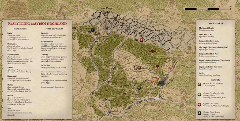 Campaign map of Hochland. Credit: Charlie Brassley, compositing maps from the Winds of Chaos website in Photoshop.