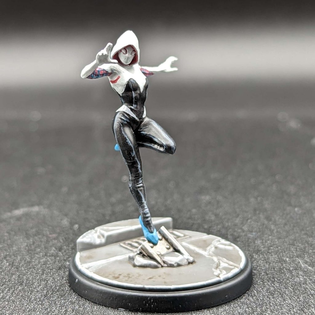 I love Spider-Man characters and all of their designs. When I was getting into MCP I looked at all the Web Warriors and thought they were scratched a type of elf bullshit itch, but didn't seem as oppressive so I pulled the trigger. Ghost Spider is the third character I had to paint mostly white and unlocked my love for using Ulthuan Grey as a basecoat for my whites.