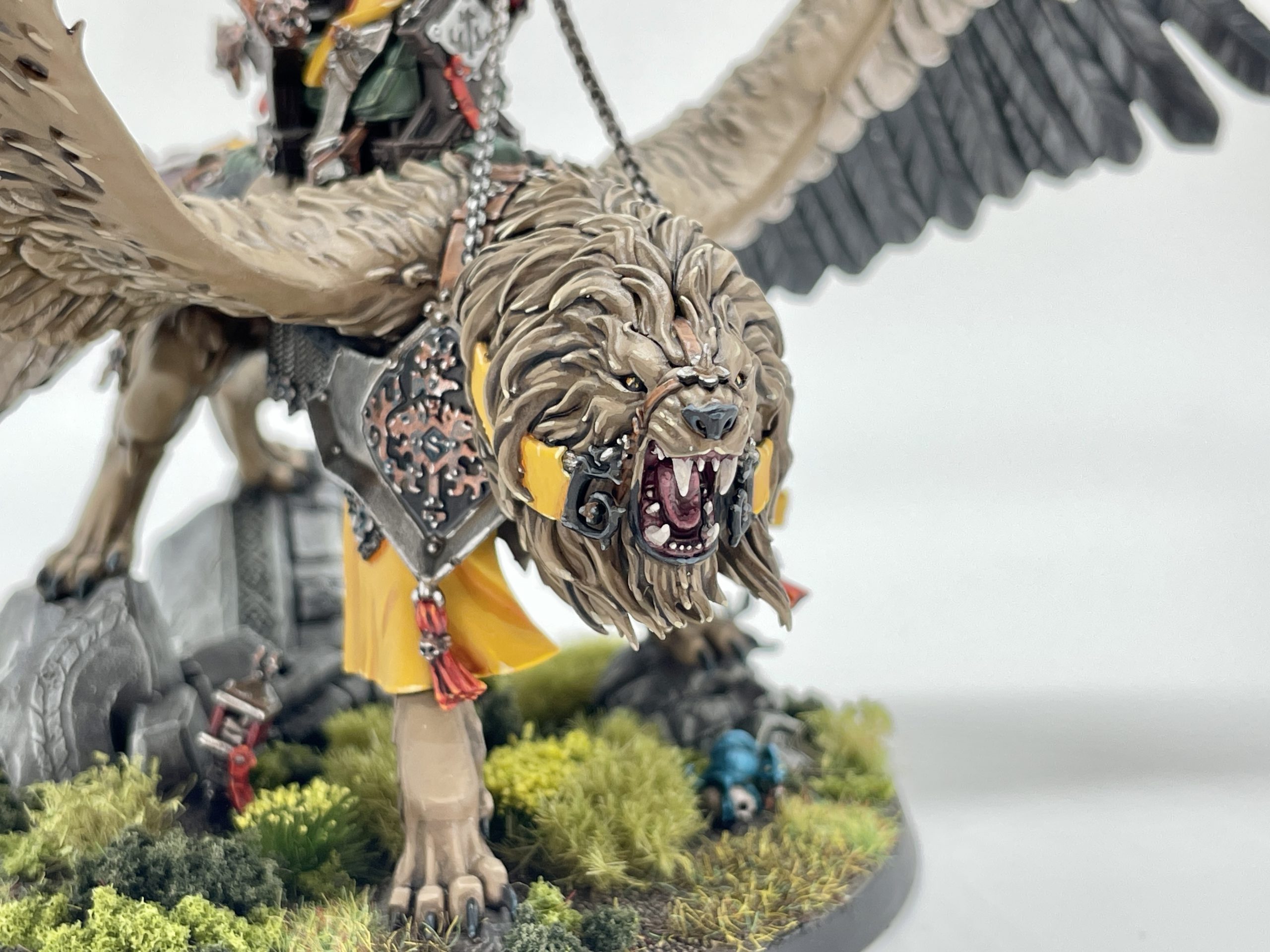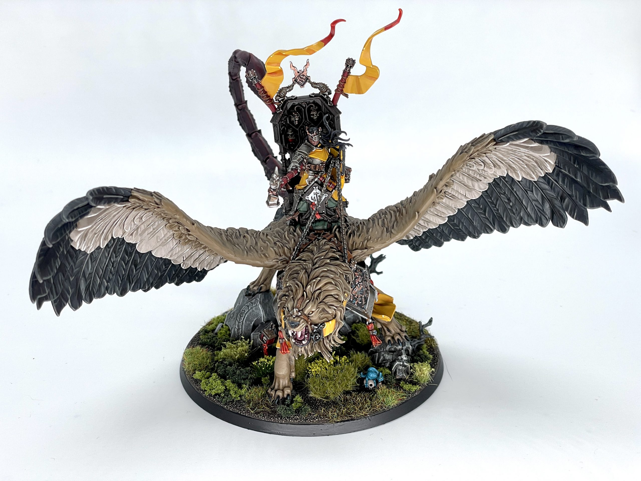 lot. I'd go to paint one coat on the feathers, and it would take me an hour and a half. I'd mix up the next color, and repeat the process at least twice more. I could not tell you what ratios or mixes I used for anything aside from the elements that show up on the rest of my Cities army - all that fur, feather, and scorpion chitin is off the dome. Once I was done, I just had to decorate the base with the full gamut of my basing materials. Seeing this model come together was hugely satisfying, and represents likely the most effort I've ever put into a miniature. I aim for one big centerpiece model a year, and I'm glad this year's could be Tahlia.
