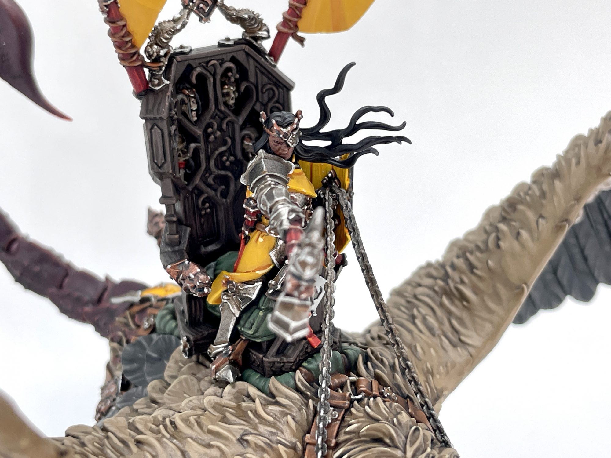 I started with Tahlia herself, as she's just a character model with a big chair. She wasn't tough, but working around the branches on her chair was kind of a pain. There's also a secret compartment in the back of the chair with a scroll and a spider in it, but it's forever sealed away behind plastic glue. She's a wonderfully characterful model, and her face absolutely oozes scorn. Great bit of storytelling on the heads in her throne too.