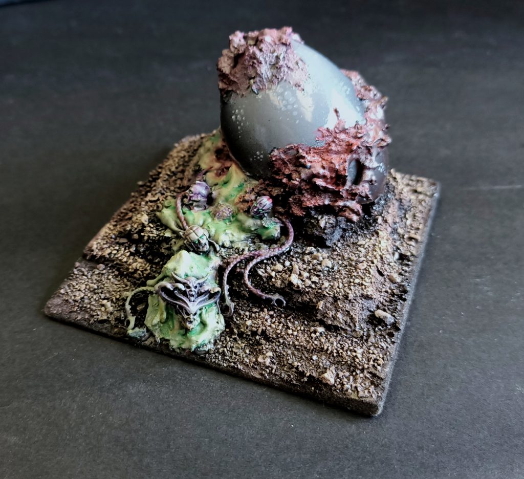 The Cosmic Egg. Take a Kinder Surprise Egg (the most dangerous thing you could import into the US), slop some various horrid textures on it, drop a few screaming heads in the goo and you've got a reality-bending monstrocity on your hands. Contrast paints are amazing for adding depth and visual interest to terrain pieces quickly and easily.