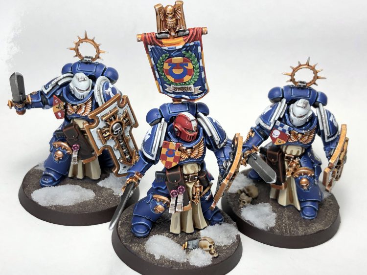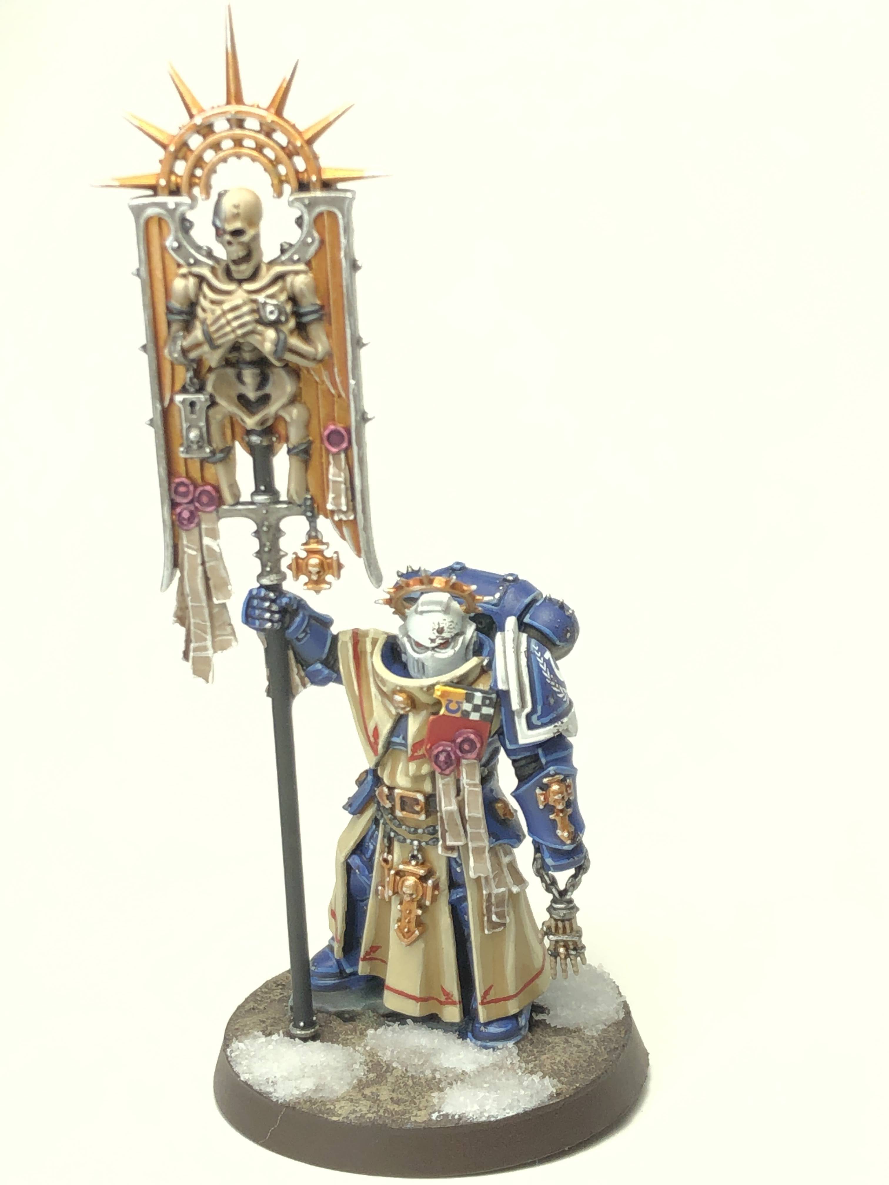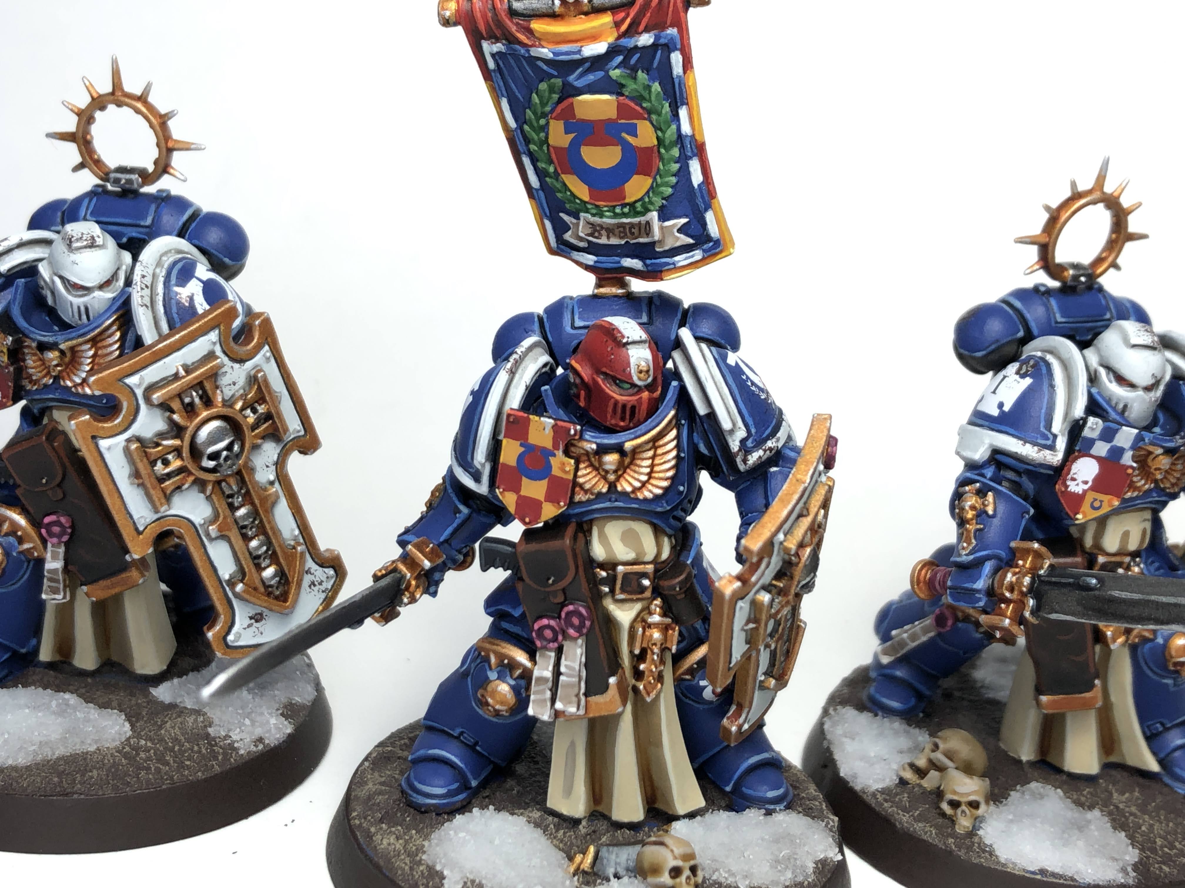 I liked the model well enough, but something about it didn't click with me. Maybe it was the Stormcast-ness of the halo helmet and the dead dude on a stick, maybe it was the lack of space for glorious heraldry. When I finally put brush to model after seeing Greg's take on the model last month, I finally figured it out - the vast expanses of blank robes were throwing me. To remedy that I painted a keyline all the way around, with little dagger details in the corners. Between that and the bit of heraldry I did on the tilting plate, I'm extremely happy with this dude. I went with white trim as the Bladeguard are all going to be 1st company for my Ultras. Speaking of...