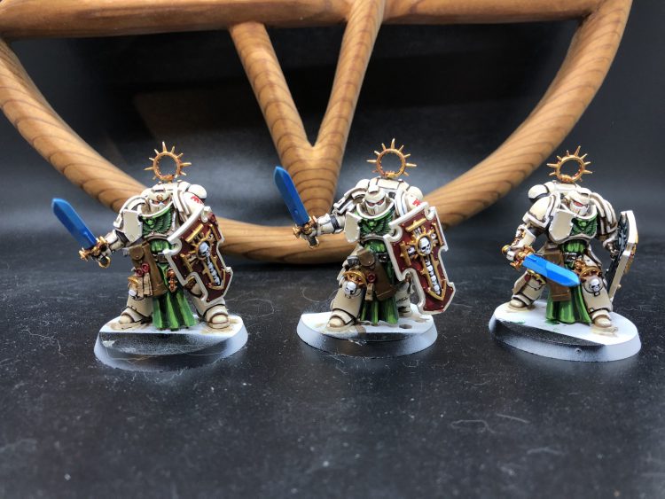 I finished the three Bladeguard Veterans from Indomitus! I absolutely loved working on these extremely detailed sword n' board bois. I made sure they each had individual heraldry, and did my usual thing of putting a backbanner on the sergeant.