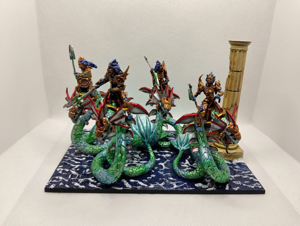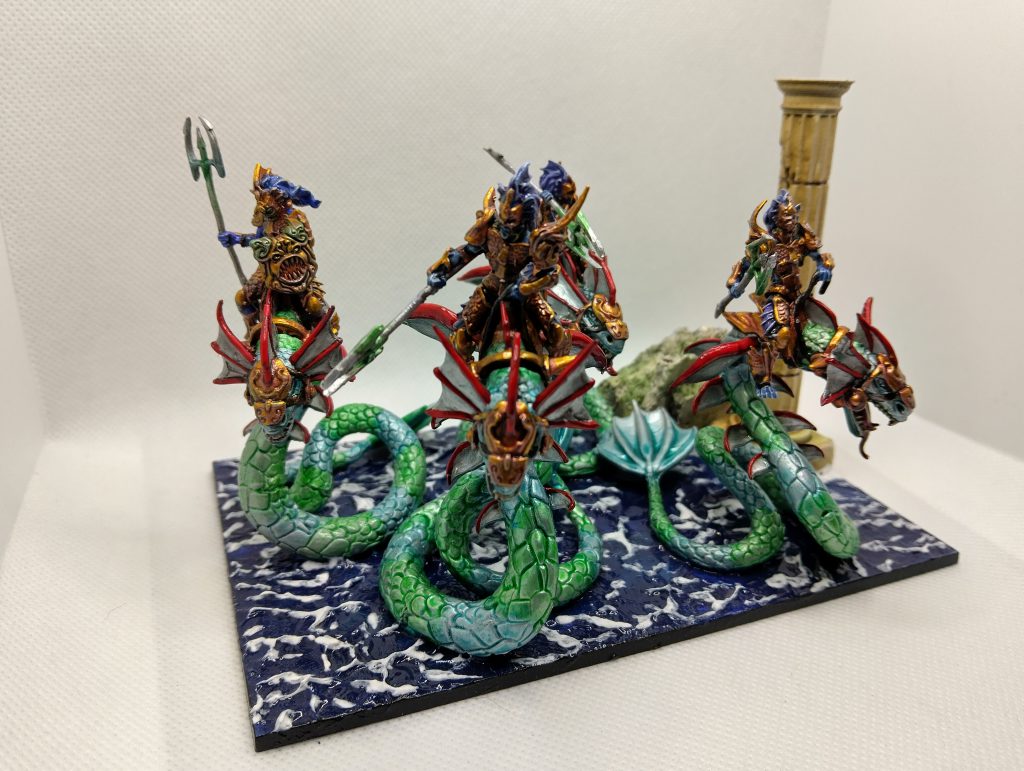 Of the various Kings of War armies I have been working on, Trident Realms was perhaps the trickiest for me. Not because of the models themselves, but rather because I had acquired two different collections second-hand, and had my own collection as well. I had three different colour schemes (not to mention basing schemes) going on, but I put off bringing them together as it would require repainting and rebasing a lot of minis.