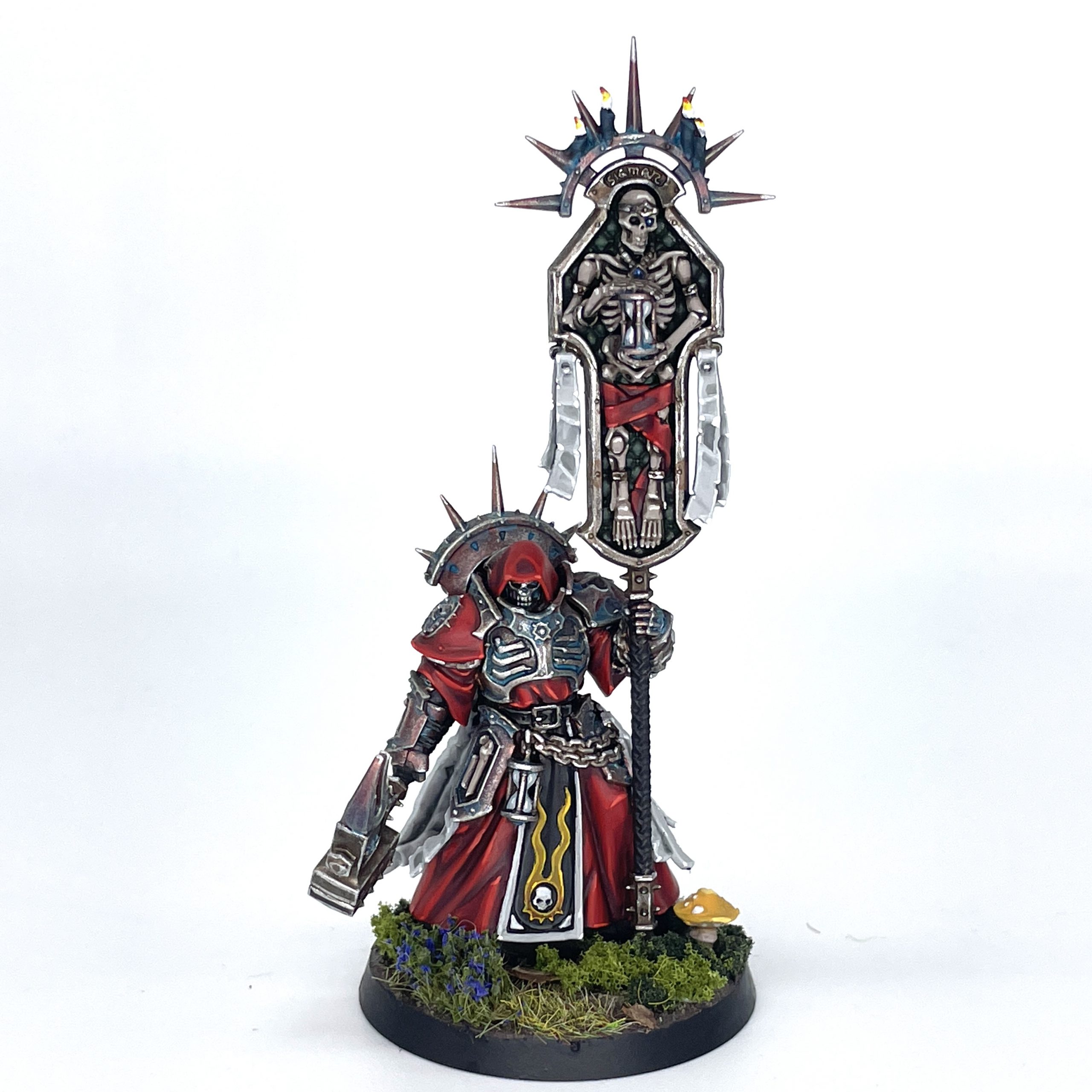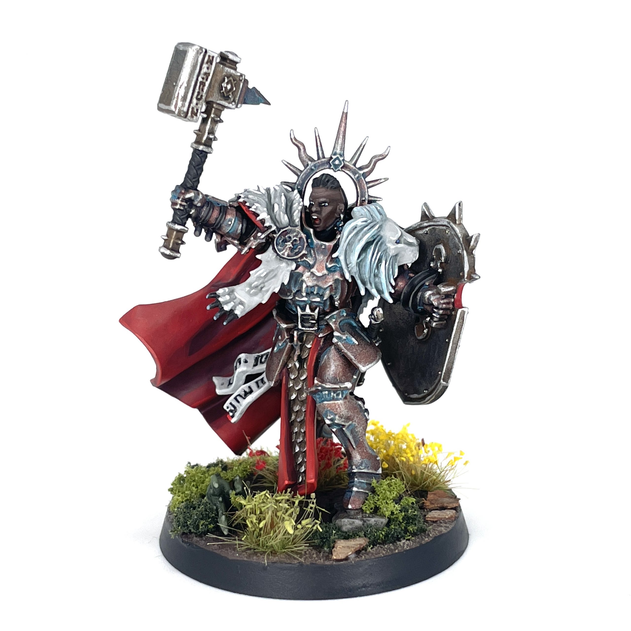 With my palette thoroughly cleansed, it was time to return to my Stormcast. These models were like putting on a broken in pair of boots, comfortable and well worn. I went for a White Lions of Chrace look on the Lord-Celestant's lion mantle, and a darker skintone to really pop from between that and the halo. On a related note, I could have pushed the color contrast on the Lord-Relictor's candles more, as they kind of melt into the verdigris on his bronze armor. I also went for a bronze facemask on him, as I think it looks more sinister than the white he's often painted with.