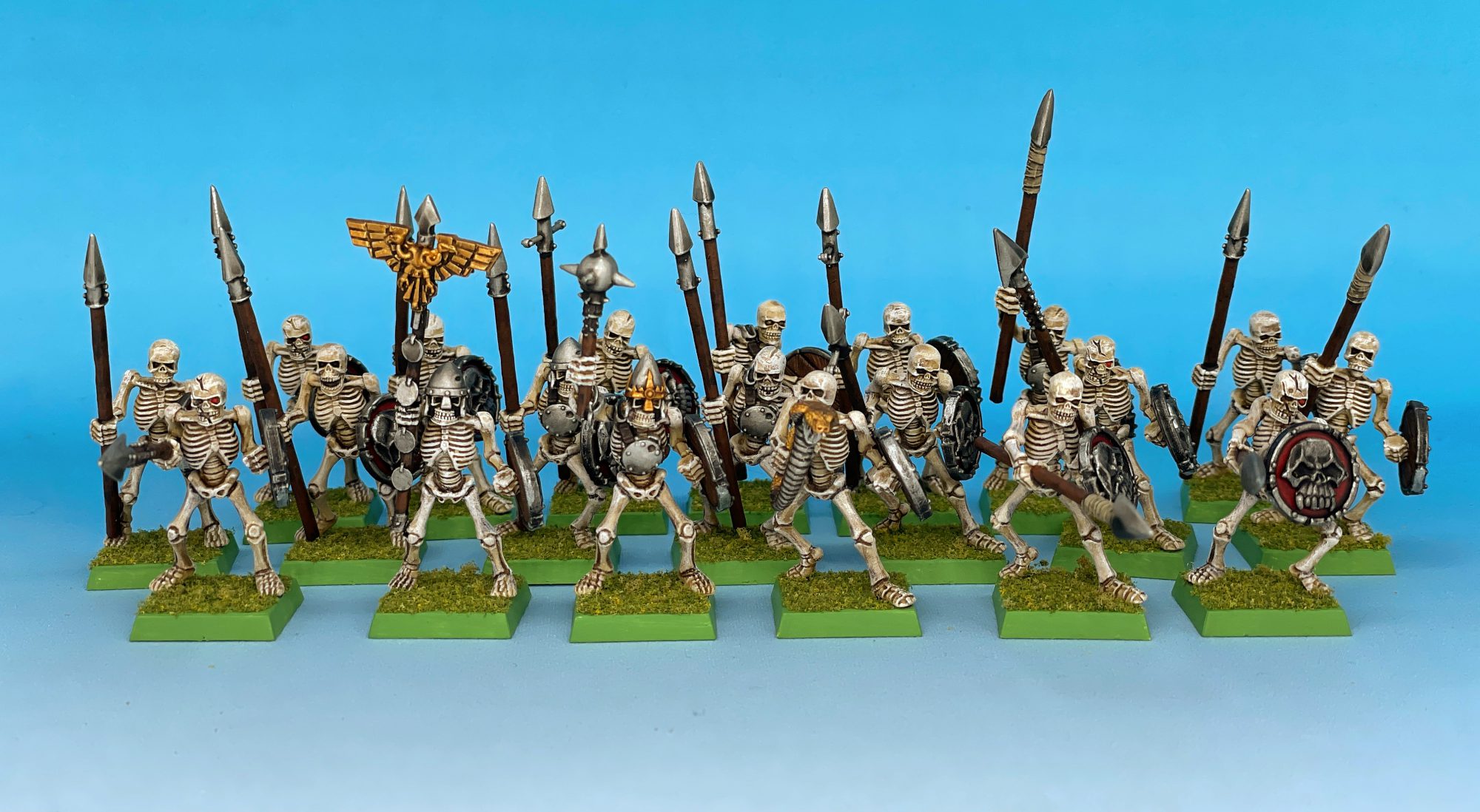 And on the painting desk at the same time were 20 Skeleton Warriors to round out my collection to 60. Though at this point I should probably make another command section for flexibility. Simple work on these, spray, wash, dry brush, metal, wash, base, done. Under 15 minutes a mini and the look pretty alright.