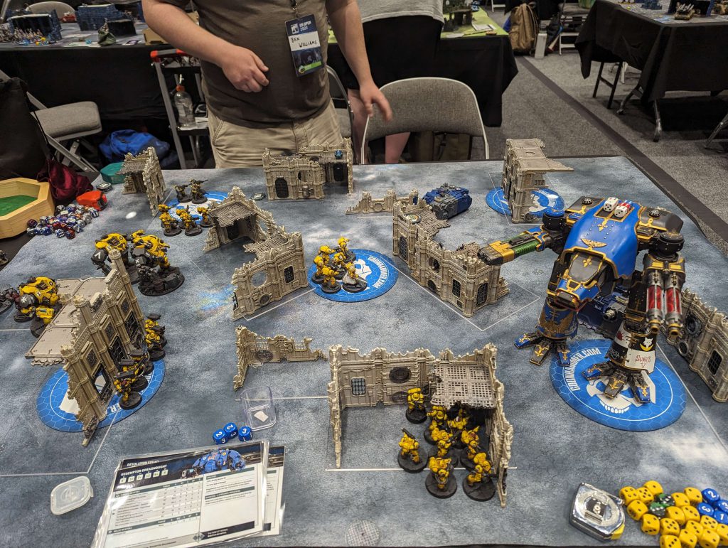 My second win was in round 4. This game, I faced off against Custodes, an army that I had no practice against and very little knowledge of overall. My opponent had several units of 3-5 Custodians, all with a character leading them, as well as a Land Raider and a Caladius. I chose the same secondaries I had in the previous round, more because I didn’t have any better choices. We deployed, and he was the roll-off. His first turn he moved several of the squads forwards towards the objectives and shot both tanks at the Warhound. The Land Raider straight whiffed all of its shots, not able to damage the Warhounds Toughness 13. The Caladius did not miss. I had to make two saves, and rolled a 5 and 6 for both invulnerability saves, a very lucky roll. Yay Void Shields! The only damage it took was from a heavy bolter round, I think. It did 2 damage, that’s what I remember.