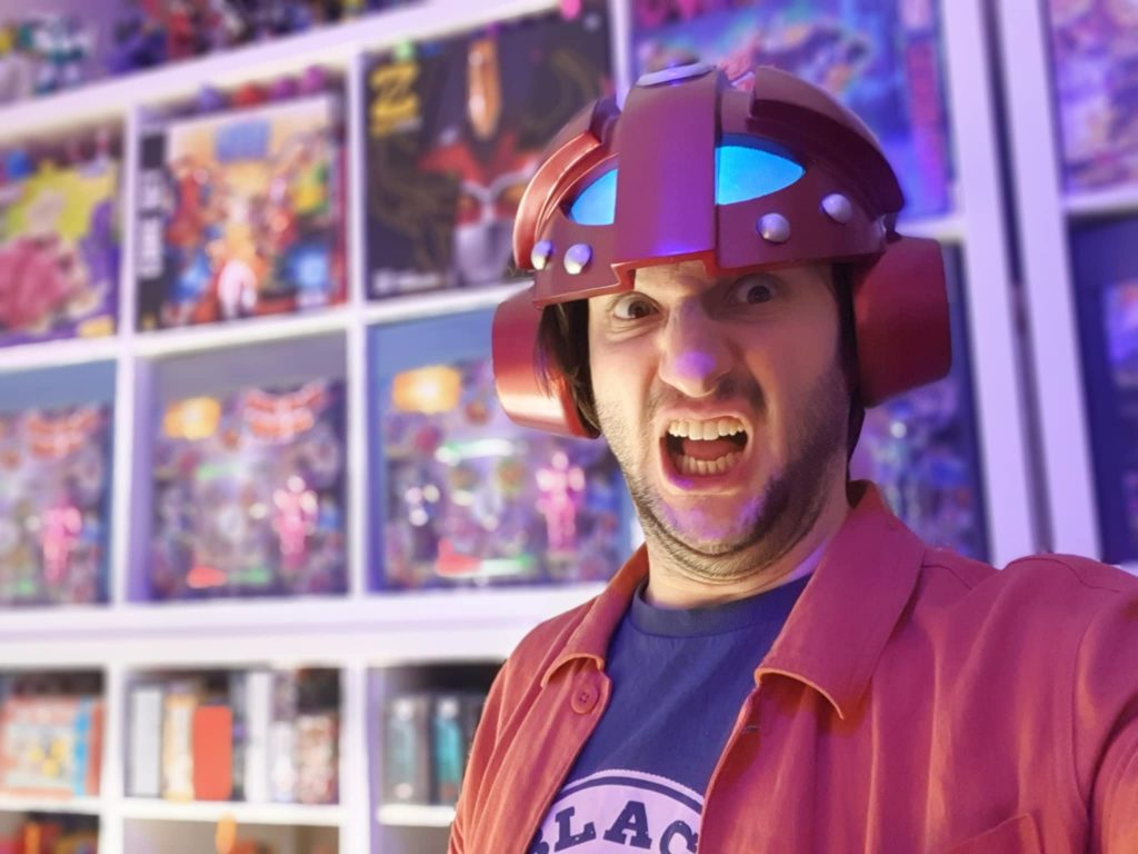 Chris posing with his collection of Super Robotic Warriors, and sporting a lifesize Röknaut helmet!