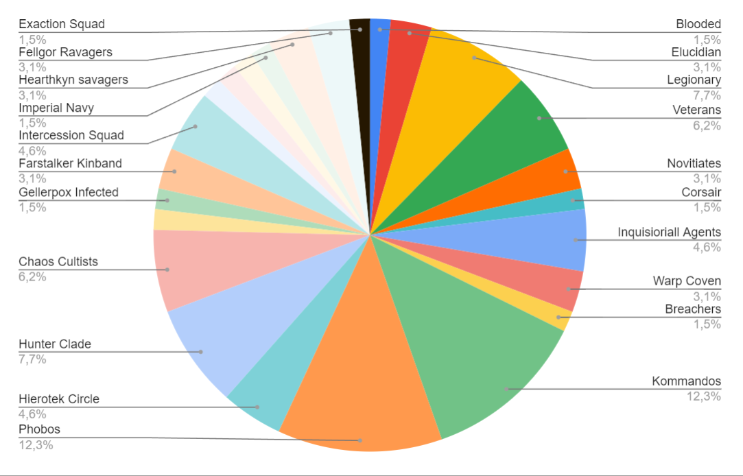 Let's start by looking at the team composition of players at the event, which shows a very healthy spread with representation from a large number of factions. Note that in this chart "1.5%" represents a single team, and 3.1% represents a pair of players.