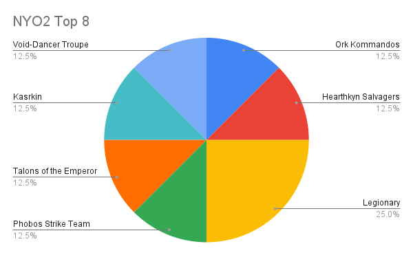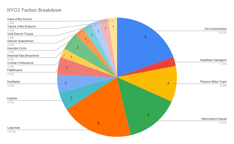 LVO packet (link), in Map 1 and 4. We do love to keep players on their toes, eschewing map packs and forcing players to really engage with the terrain presented to them. Insofar as the meta is concerned the North East remains very focused on the Kommando threat and its responses, leading to a slew of Elites taking center stage. This shows up in teh faction breakdown (below), where you can see 8 Kommando teams to 18 elite teams.