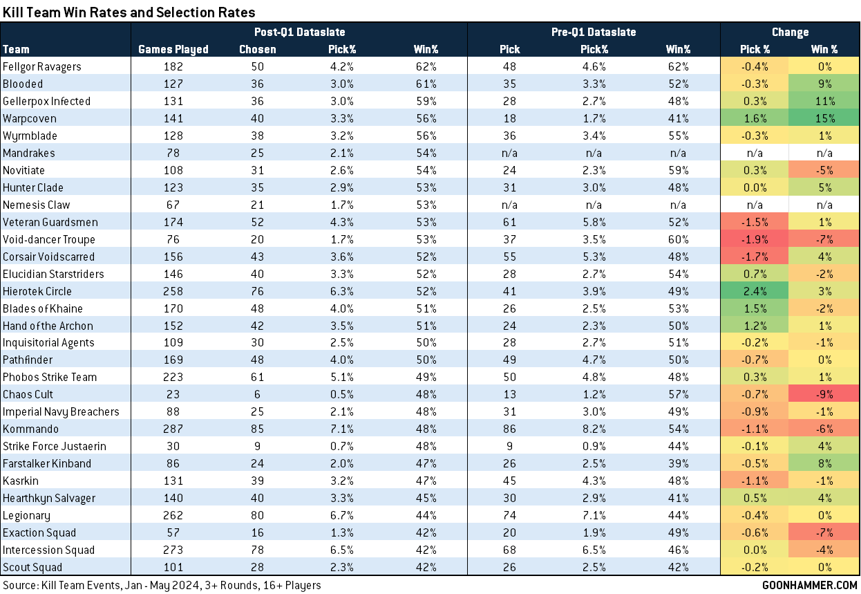 Let's start by looking at broad win rates for each Kill Team. While win rates don't tell the whole story, they do represent a very good starting point, especially when we have a healthy amount of representation for each team. We can also look at how these have changed since the Q1 dataslate dropped.