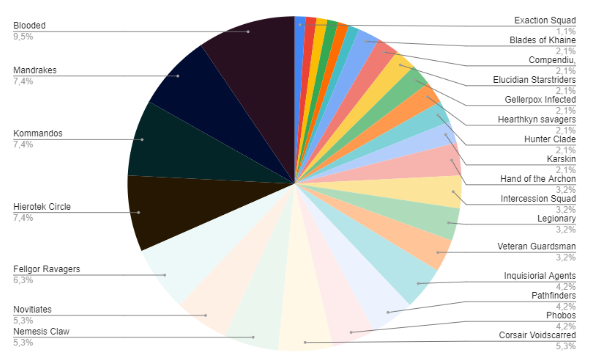 - And finally we have the factions that need some help. Scouts are not finding their place as well as Exaction Squad, and Chaos Cult has gone from being a preeminent faction to being completely missing from the Top 8.