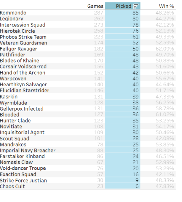Kommandos remain the game's most popular kill team, with Legionary and Intercession Squads right behind them. That said, it's not great news for Kommandos - typically larger player counts push a team toward the 50% win rate unless they're really busted or terrible, so Kommandos at 48% suggests they're a bit underpowered, while Intercession and Legionary teams at sub-45% says those teams really need help.