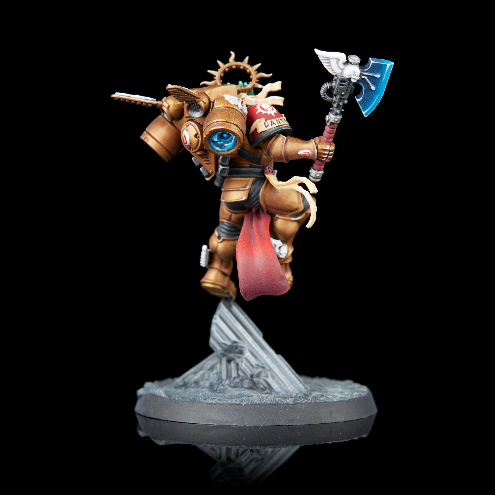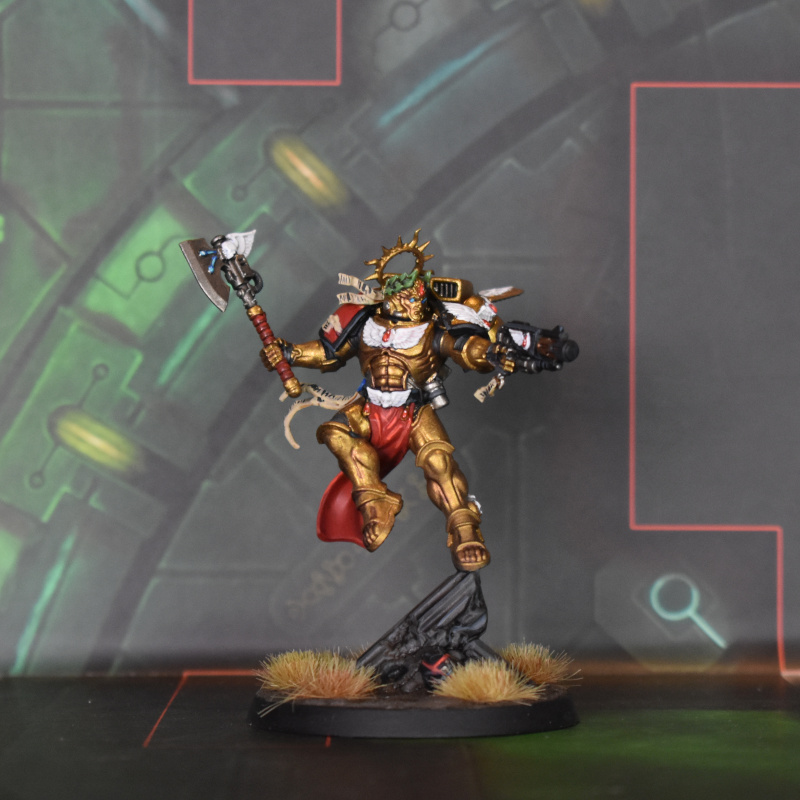 The nice thing about Dante is that most of the model is gold. Darkstar Regency Gold with a thin wash of Druchii Violet in the recesses does the job for me. The other big area is the white, which is not a colour I love painting, but it's a nice contrast against the gold so I decided to commit to it. Vallejo Model Colour White did the job for me here, as a white that actually covers well. Beyond that it's all just GW paints, the ony notable one of which is the Word Bearers Red for the handle of the Axe Mortalis, which gives it a nice deeper, darker tone than the gems and loincloth/shoulder pad.