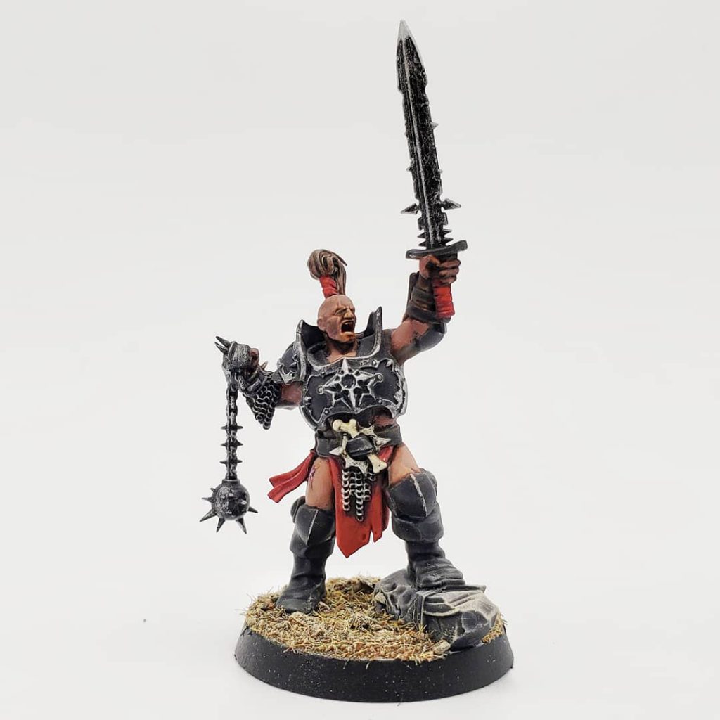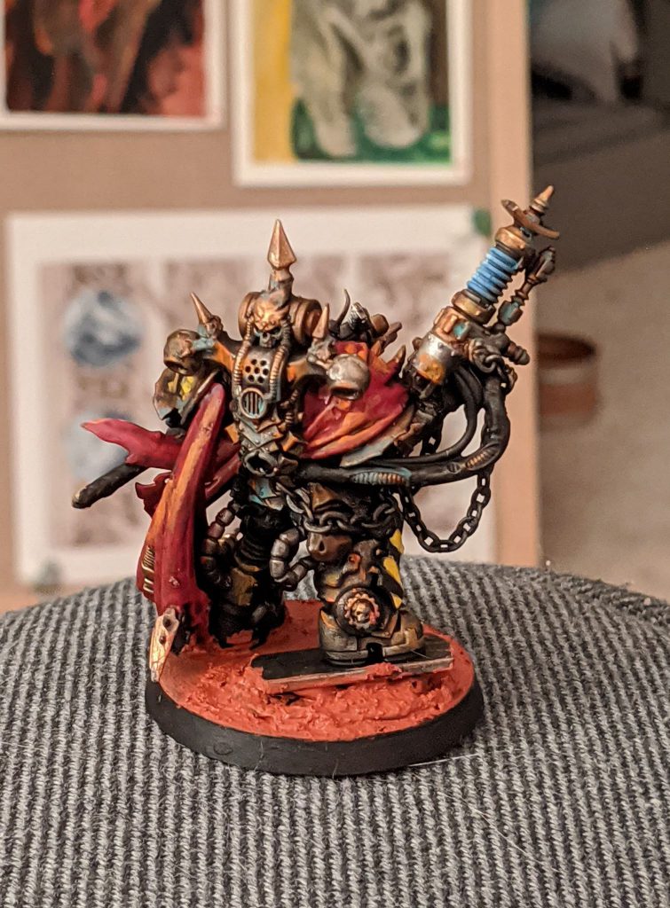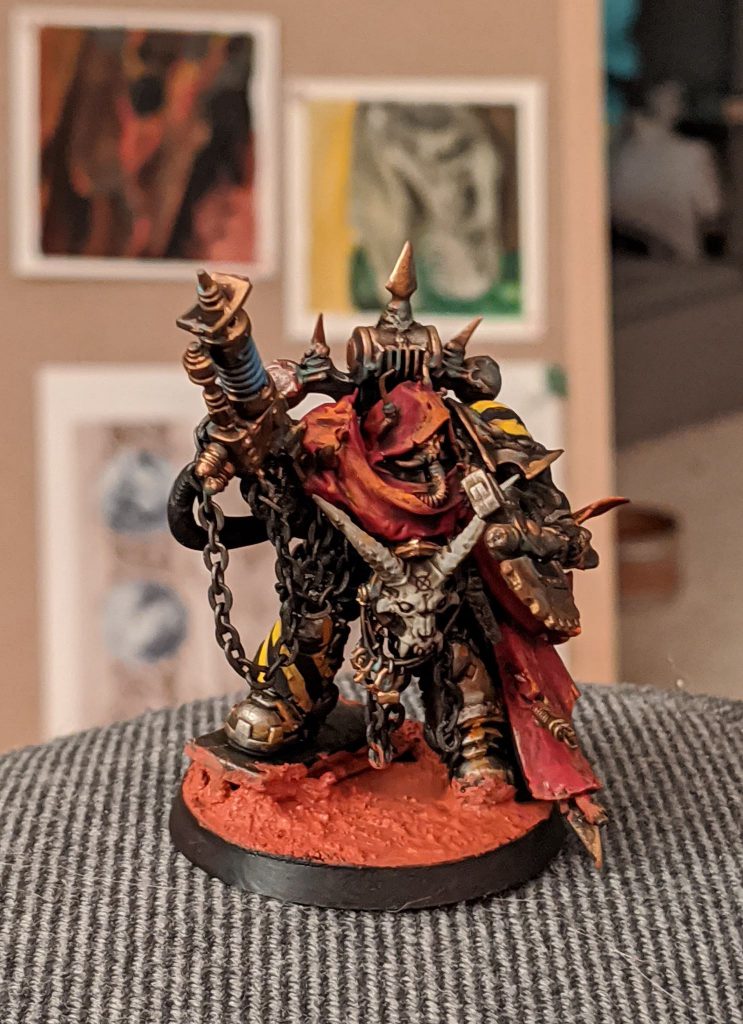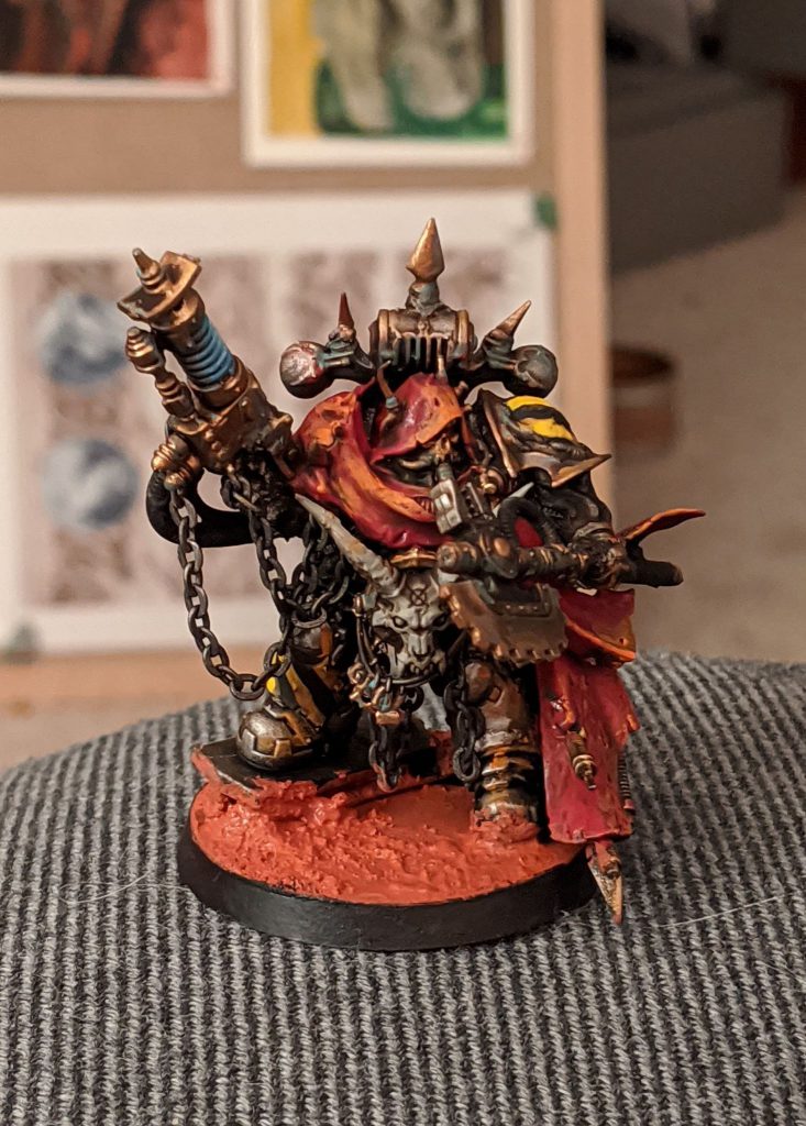 I've been pushing through a lot of my backlog over quarantine, and also having fun kitbashing. I had half of Feirros left over from a Lord Discordant conversion I did a while back, so I pulled some stuff together to make a fancy Chaos Lord. With primaris legs he towers over cultists and stands out quite nicely.