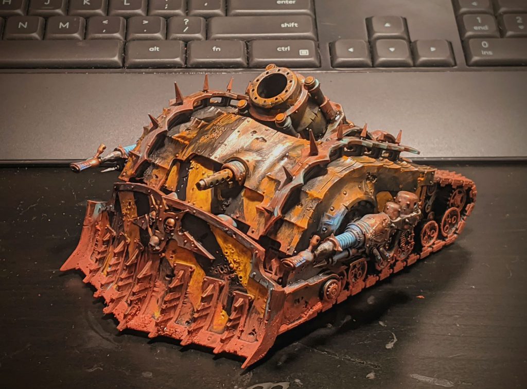 Next up, I'm working on a trio of Plagueburst Crawlers, here's how the first one came out. I've got some ideas for iconography to differentiate it from my actual iron warriors, but I'm gonna practice my freehand first.