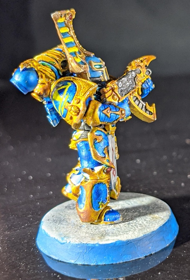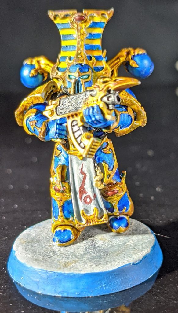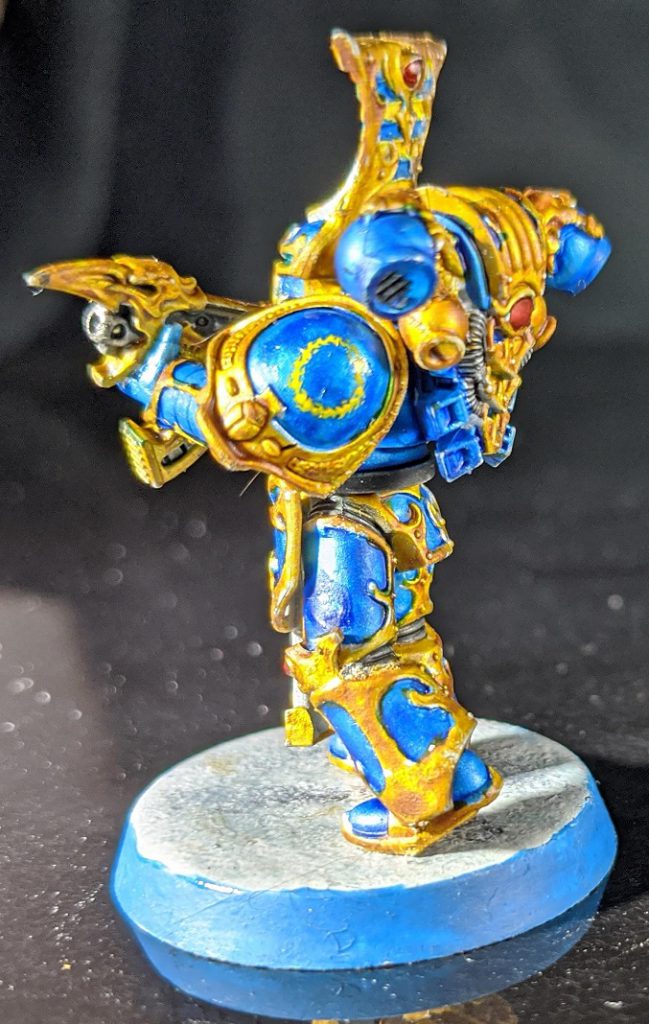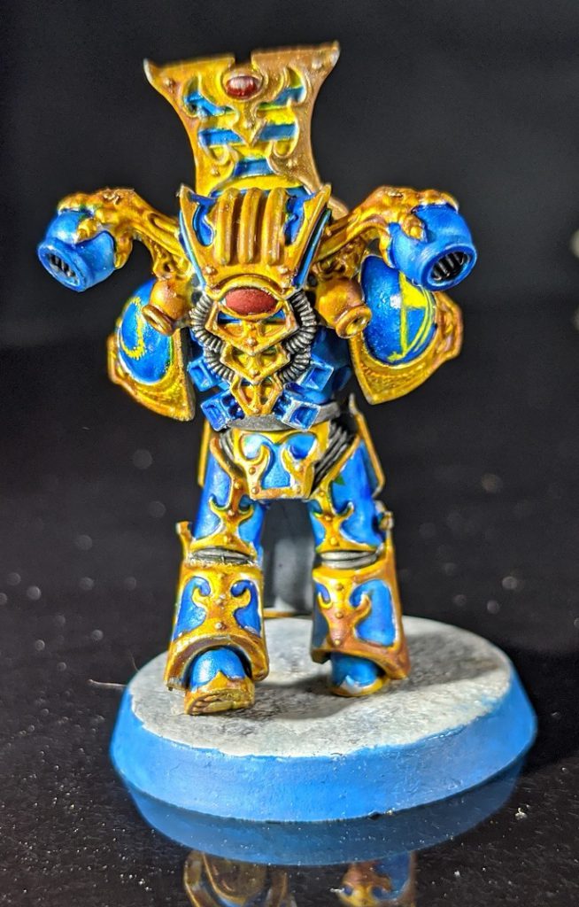 I wanted to try something new after a bunch of orks and Iron Hands, so people suggested I grab the Start Collectiong Thousand Sons box. This was mostly done with contrast paints. I tried a couple of different styles (which you can see on the helmet), and people preferred this one. The blue and gold were mostly just done through contrast paints over bright metal (Vallejo chrome). The symbol on his tabard was done freehand. Not super happy with how it came out, but that's why we practice.