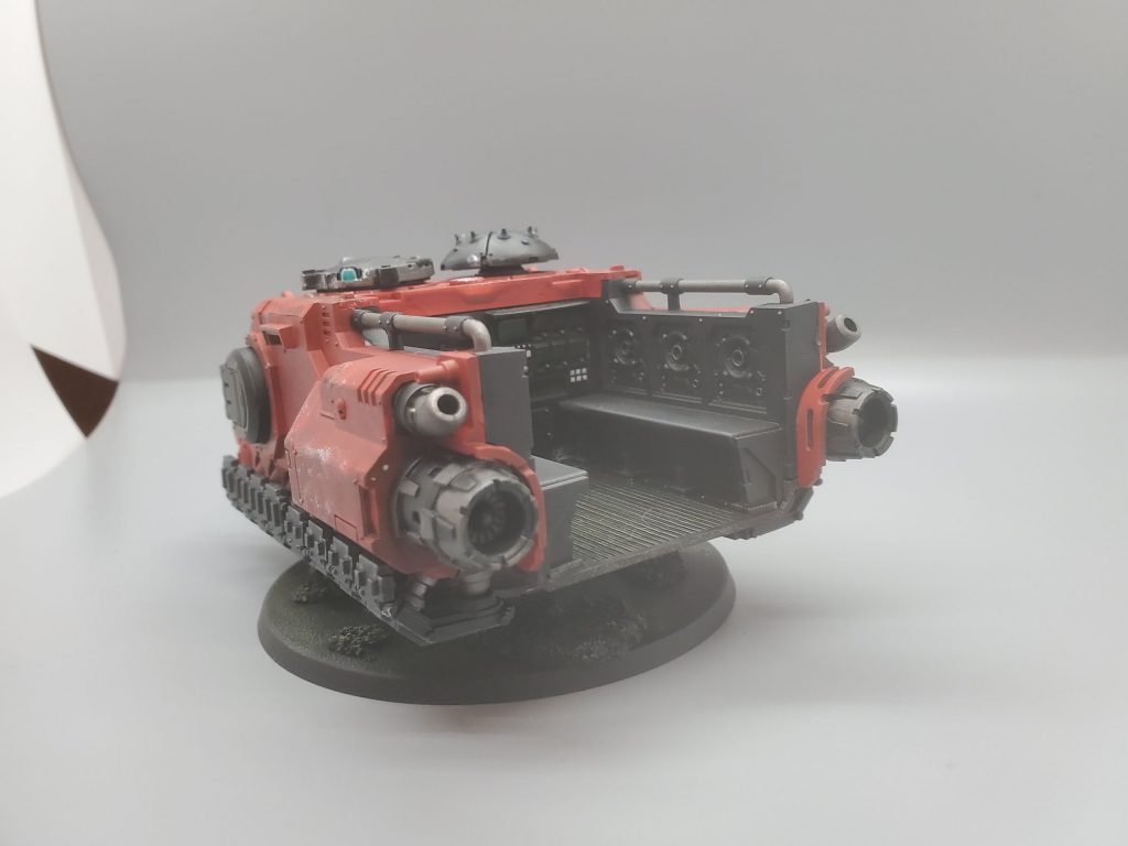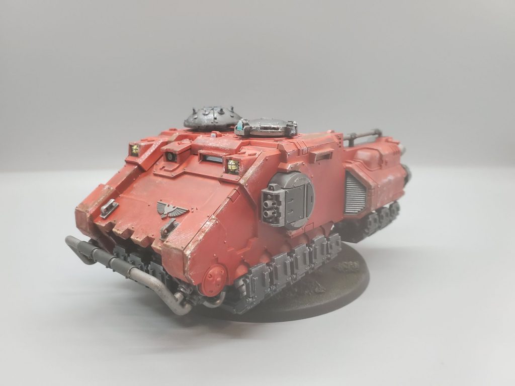 These couple of weeks, I worked on a pair of Impulsors for my Crimson Heralds Space Marines chapter. For the hull, I did the same spray through the mesh bag effect used on my Castellan (Corrode: see last month's round-up), but with grey. Then I hit the whole thing with Blood Angels Red Contrast. Unlike the Knight, I did some weathering with sponged silver paint and pigments. Unfortunately, I was a dope and did the weathering before applying transfers, so I'll probably have to weather it again in parts.