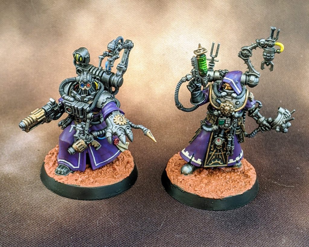 Next up are Daedalosus and a Cybernetica Datasmith. Both of these were fun to paint and pretty quick. The robe on the Datasmith has a huge seam on one side that I forgot to fill prior to priming. Hopefully I can avoid that in the future. I gave Daedalosus a more life-like skin tone since he seemed to be fairly new to the Mechanicum and might still have enough of his original body left to be kept alive by his human circulatory system. I tried out the new Tesseract Glow paint on Daedalosus’ gun here along with the dominus and it’s a nice quick way to do some cool glow effects. I recommend people check it out for all their green glow needs.